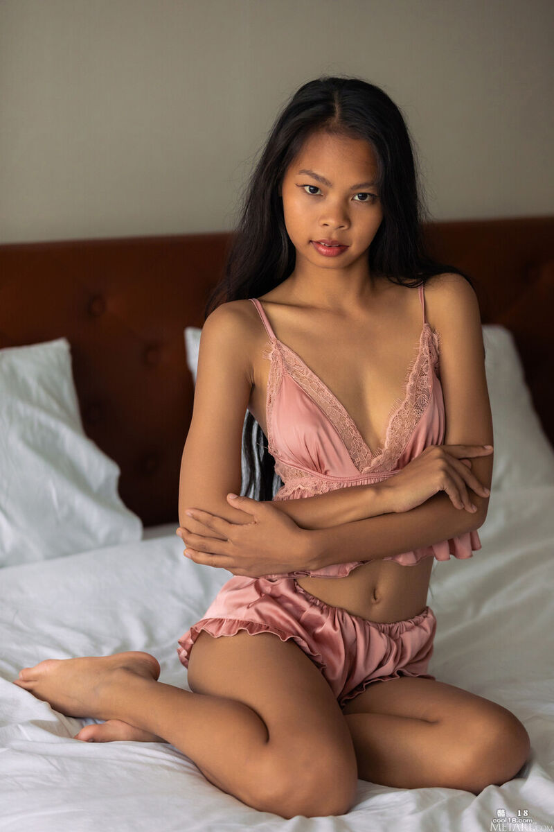 娇小的泰国少女脱光衣服展示自己的小奶子和光秃秃的小屄
