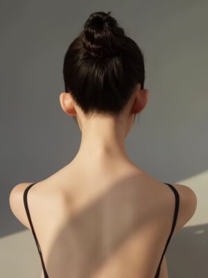 翻开相册的下一页,有一张一瞬间吸引了我的眼球。只见芮嘉身穿卡其色高胯舞蹈体服,侧身的姿态让她的上半身尽显优雅与自信。她闭着眼睛,仿佛在感受舞蹈带来的内心平静,唇角微微上扬,透露出一丝满足。她的肩膀和脖颈线条流畅自然,体服完美地勾勒出她的身体轮廓,衬托出她的柔和气质。尤其是高胯的设计,三角形的区域让人好奇心大起,想一探究竟。挺拔的身姿,迷人的曲线,让人不禁赞叹。尤其是翘起来的小屁股更显得腰肢纤细。阳光从一侧照射过来,给她的肌肤镀上一层温暖的金色光辉,使她的舞蹈姿态更加迷人更加动人。这一刻,她仿佛与世界融为一体,静静地诉说着她的舞蹈故事。