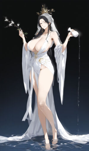 其身躯却与那庄严肃穆的形象形成强烈反差。 她身着一袭轻薄透明的白衣,布料极少,几近透明,丰满挺拔的双峰几乎要