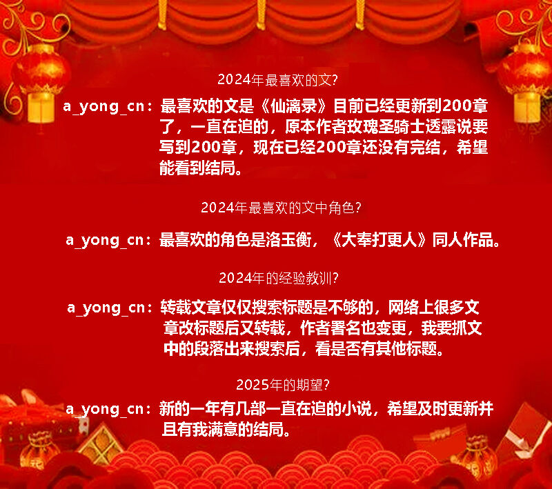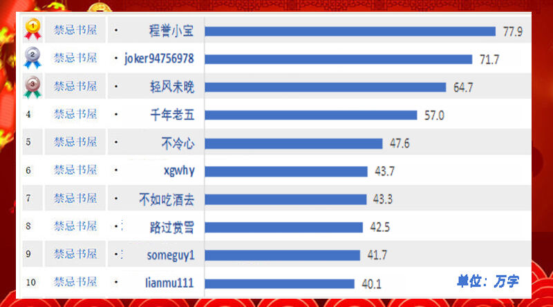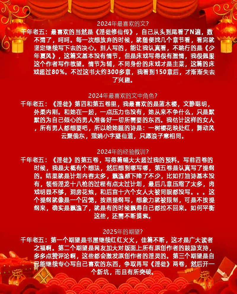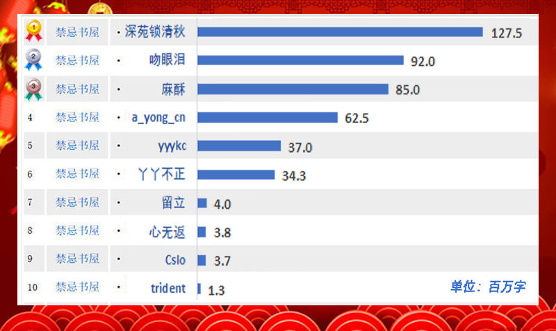 [贺岁]★迎新春★[书屋]龙年年度榜揭晓,为热心网友鼓掌喝彩! 出《热帖回顾》的时候,每年都会有读者说咱们的[人气热帖榜]有多不靠谱,虽然提到的文都是占据前三的位置,但能看的十个中间有一个就不错了。结果不言而喻,我每年回顾的六七十篇文,虽然展现了点击赢家,但在帮助网友挑文阅读上,谈不上有多大帮助。一是因为[书屋]有恶意刷点击的现象,还有就是有些文的名字有吸睛(/精)属性,这些和文本身的可读性一点儿关系都没有。我每年回顾里都有提,和众位网友观点高度一致。 自然而然就带出一个问题:嗨,版主,既然你每年吐槽这么多文,为什么不挑些好的? 每次看到网友这么说,我既欢喜又擦汗,欢喜是因为网友默认我可以挑,擦汗是我凭啥可以挑?坦率讲,我看色文是没当版主的时候(譬如十年前)。当版主之后很高兴,跟自己说这以后都在眼皮子底下了,看文不是信手拈来的事儿。结果就再也不看了,而且还只关注些没名堂的事情(这文的123怎么找不着啊?这个账号怎么又来刷帖?这个评论挺有意思……之类的)。更不用说,写得好才有挑的资格,不然谁甩啊,对吧?!毕竟说三道四之前自己得先拿出点儿本事。 说实话,能将每年的《回顾》变成集中读者推荐的《回顾》,是我梦寐以求的目标。每次看到一篇质量高的评文吐槽,我比看到一篇好文还兴奋。但是这样的帖子好少啊,今年十二月初就开始吆喝网友贡献点儿文章(链接),丰富这个《回顾》,可惜响应的人就三四个。大家如果有更好的办法,请一定提出来。 目前呢,我只能每年年初厚着脸皮跟留园运营要更多的数据,再出这篇《全年盘点》。一方面是滤掉那些疯狂刷点击的,另一方面也想滤出真正出彩、受欢迎的帖子。说实话,大到色文界,小到[书屋]这方天地,一篇文吸引读者点击不难。[书屋]做到今天已经算老版,是个帖子都有人点,发出来总是会有人看。但让读者看完后点赞可就不太容易了.如果能吸引读者花点儿时间留下只字片语,那简直是地狱级别的难度。 这次,还是按老规矩,从地狱级别开始。评 论 榜 评论数量是指主帖下的跟帖总数。转帖大拿的楼帖会被剔除(和评论无关),自动回复的点赞帖也会被剔除(我们有专门的点赞榜),自动回复的红包帖和赠给主帖帖主的金币帖则保留下来。虽说这两项和讨论文本身差了一帽子远,但[书屋]是个把白嫖当习以为常的地方,掏出兜儿里的真金白银,甭管只值几分钱,至少体现双方的诚意,咱们无论如何都会支持。 今年的榜单,我给自己留了一个位置。和去年的理由一样,塞私货的唯一原因是评论数从来都是[书屋]的软肋。没我的帖子,数字太可怜,我用财大气粗拉高点儿平均值。而且,我必须借这个机会感谢[书屋]网友。集腋成裘、聚沙成塔、众木成林,虽然大家只是芸芸一员,但每个人都是[书屋]最宝贵、最珍贵的财富,我这个版主当的风平浪静,和所有逛[书屋]的网友密不可分,所以要用每一次机会尖叫感激热帖回顾(105)、兔年年度榜揭晓(73)、原创征文(49)、好文推荐(47)和股价新高(37)。 今年评论榜榜首《紫狂因[六朝]系列的官司》发布:godsnow不是新话题(链接),耳熟能详的色文大拿两年前一夜之间从各大书站忽然消失,很多热心读者都非常关心。榜单第五名《一些原创作者的消息》发布:四合院青松也是原创作者分享他所了解到的信息。罚得那叫一个狠啊,也这才知道这些作家写到顶尖好赚钱啊!十一月份这个案子有了新的进展,此帖是网友发布的最新信息。我起初还皱眉头,不太感冒冷饭热炒,甚至说要删帖。但是看了跟帖后改变主意,颇有耳目一新的惊奇。 以前咱们网友聊起这件事儿,总是从中国大陆禁黄直抒胸臆。官方的调门之高大上,大家说起来充满不屑和鄙夷。网友iscking则从出版社利益的角度一条条剖析吐槽(譬如:出版这种事找出版社去,自己别碰),这是咱们网友从来没有提过的。仔细想想,国内写黄的作者一大堆,不仅逍遥自在而且还能拿大奖。所以啊,个人的身心健康和当官的没有毛线关系,让人颇有天下熙熙,皆为利来;天下攘攘,皆为利往的感慨。放在我身上也一样,我只会说幸亏国内仍然严格禁着刘备体,咱们[书屋]才能一直有人来。哪天真开禁了,我估计[书屋]的人气将直线下降,我这个版主也分分钟凉凉。 这个帖子能顶到评论榜第一,主帖帖主没怎么参与,倒是网友iscking的贡献颇大。他是色文书站的资深(虽然不是[书屋]的),和网友交流的时候完全掌控。你友好、我友好;你刻薄、我刻薄。你真心提问、我知无不尽;你胡搅蛮缠,我怼你没商量。排名第二的《深渊-母子传说》(14)作者:lianmu111和第六名《我的姐姐服役中》(4)作者:子欲母爱也颇为相似,网友和作者争执芭蕉主题。有态度好的,有态度不客气的,作者都会认真一一回复。不仅刷了帖,而且刷到排行榜里。 [书屋]这样的时候不多,但是如果发生了,我会私下问问主帖帖主,是否需要我插手管理。原创是[书屋]的宝贝儿,千万别把作者气跑了。大部分作者都可以自己应付,还有些直接跟我说看就完了、不要吭声做任何事。我爱煞这样的作者!不是端架子,但是我顶烦删吵架帖。这和就事论事的争论不一样,很多会上升到个人攻击、侮辱漫骂,就好像几个人过嘴瘾爽了,让我在后面擦嘴收拾烂摊子一样。 这里真心建议一下,如何与读者交流对原创作者非常重要,尤其是不喜欢的言论。怎么能掌控气氛,既不