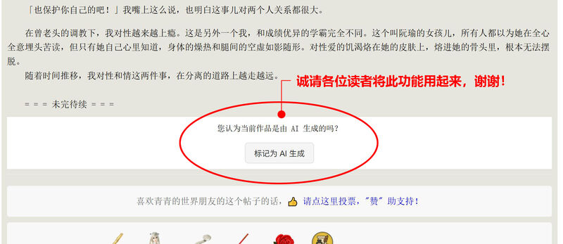各位网友,大家好! 去年书屋的AI文成几何倍数增长,而且大部分粗制滥造,很多网友都对此不胜其烦。管理员也意识到平台方再不做控制,书屋迟早被没有质量的AI文淹没。毁了书屋的名声不说,让读者找到真正优秀的作品,也难上加难。而那些不动脑子创作、只用AI工具的网友,和真正爱好创作的原创作者无差别对待,也是非常不公平的。 现在书屋的每个主帖和跟帖最后,都有一个需要读者判断是否是AI文的选项。只要大家参与进来,人越多数据就会越可靠。平台方就容易操作了,不管是降低发帖网友的权重,取消收益,甚至严重的会删除。作为读者,也可以自由选择是否屏蔽AI文。总之是先有大量的人参与提供反馈数据,后面管理员可以操作的内容就方便很多。因为运营方不能凭空靠人力去管理,以后还是靠系统自动处理,所以用户的反馈数据是第一位的。 用系统判断是否是AI文还为时尚早,而且目前书屋真心想控制的也不是AI辅助完成的文,而是粗制滥造、只用AI生成的文。譬如那种前言不搭后语,甚至连提示词都懒得删掉的文章,都是平台方针对的典型。 希望这个措施,可以帮助书屋读者在筛选文章时,起到关键作用。是否可行,还是得仰仗读者的反馈。大家有什么意见和建议,也可以提。