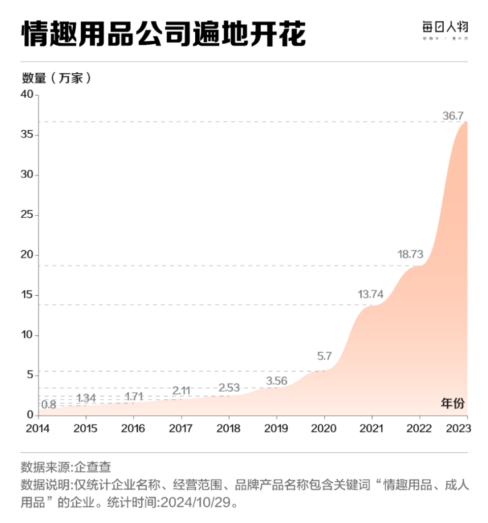 企查查数据显示,国内现存情趣用品相关企业已突破103万家。近十年来,该行业企业注册量持续增长,2021年新增注册13.74万家,同比增长141.03%,增速达十年峰值。2023年,新注册企业仍高达36.7万家,同比增速接近96%。