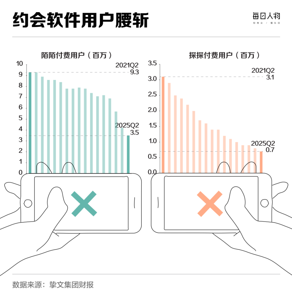 这种疲惫感直接体现在数据上。挚文集团财报显示,旗下陌陌与探探两大平台的付费用户数持续萎缩。2021年第二季度,陌陌付费用户超900万,可到了2025年同期,就只剩下了300万,减少了超过60%;探探的收缩更为剧烈,今年第二季度的付费用户只有约70万,相较于2021年已经跌去将近80%。
