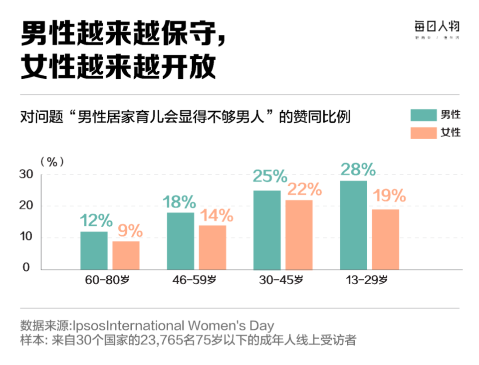 通常来说,人们的观念会随着时代的发展更加自由开放,但研究团体Glocalities在20个国家进行的民意调查发现,2014年,美国最保守的群体是55–65岁男性;而到2024年,18–24岁的年轻男性成为最保守群体。国内的研究也呈现类似趋势:一项覆盖3.5万人的研究发现,教育能显著提升女性对性别平等的支持,但对男性的影响有限。益普索《2025人口世代报告》进一步指出,全球Z世代女性正走向更自由、开放的价值观,而同龄男性却更倾向传统观念,例如在“男性居家育儿是否不够男人”这一问题上,越年轻的男性越表示认同。
