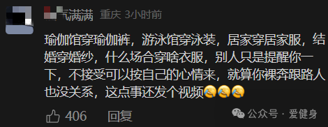 2、也有网友说:瑜伽馆穿瑜伽裤,游泳馆穿泳装,居家穿居家服,结婚穿婚纱,什么场合穿啥衣服,别人只是提醒你一下。不接受可以按自己的心情来,就算你裸奔跟路人也没关系,这点事还发个视频。