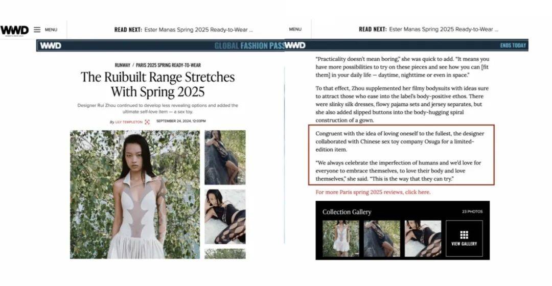 这股浪潮甚至走向国际。2024年,一个国产女性情趣品牌登上巴黎时装周。以柔软织物与象征自由的造型,将“女性欲望”带入时尚叙事,引发海外媒体关注,被评价为“年度最具突破性的品牌实践”。