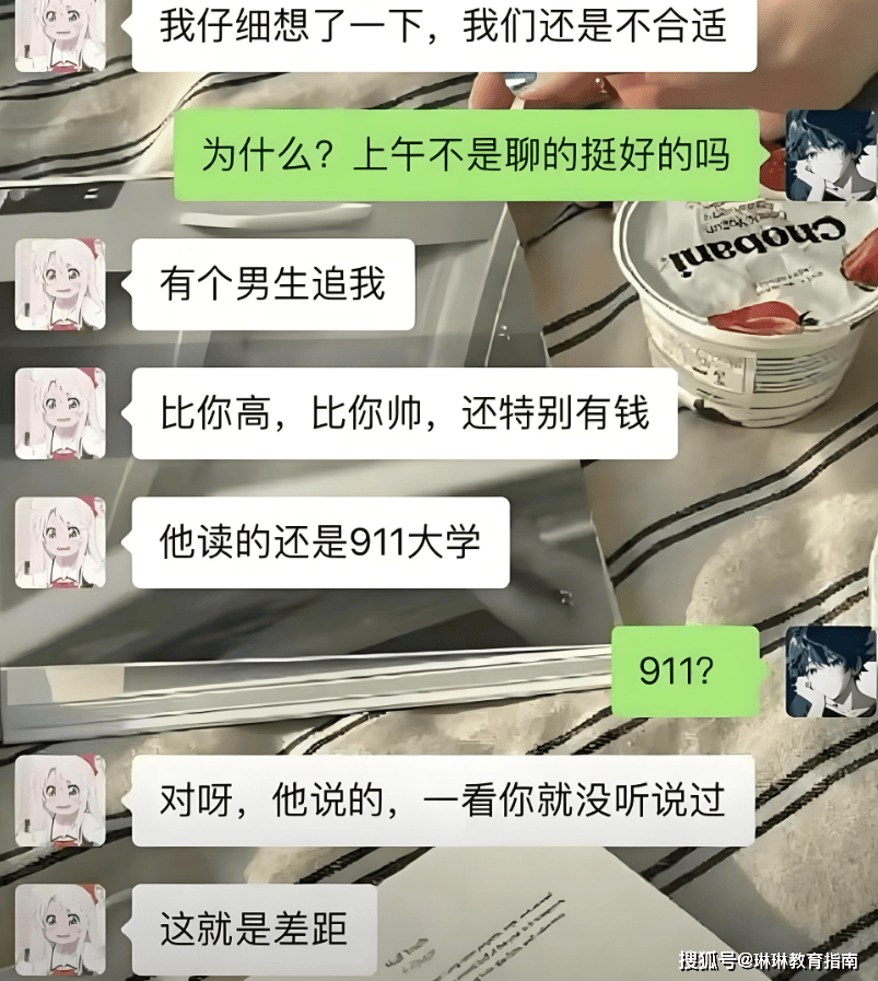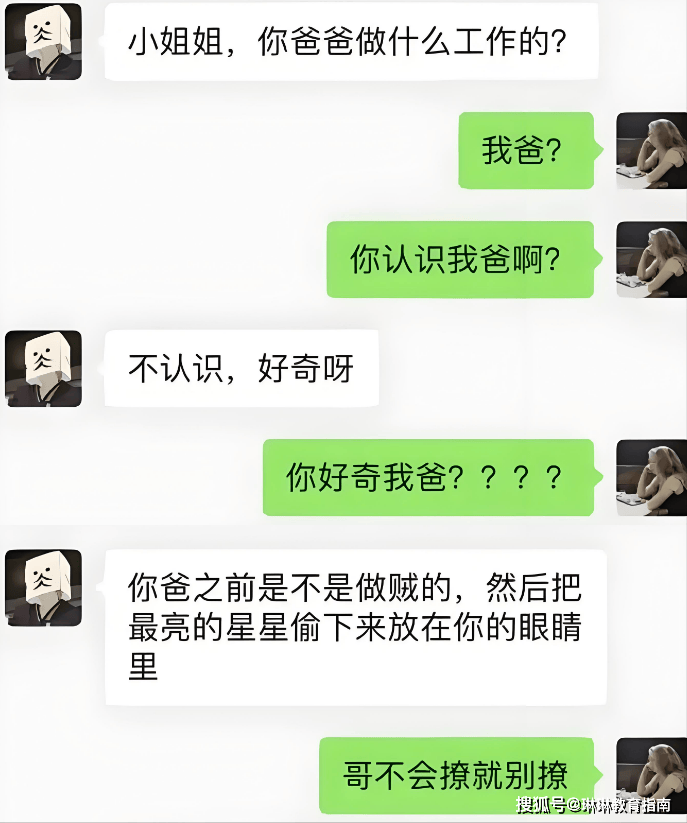 按理说第一次认识,问一问对方在哪里上的大学、读的什么专业、读书的时候参加过什么社团?这些都是不错的话题切入口,也方便双方找到适合自己的共同爱好,可这位仁兄可倒好,追问女孩的父亲是做什么工作的。