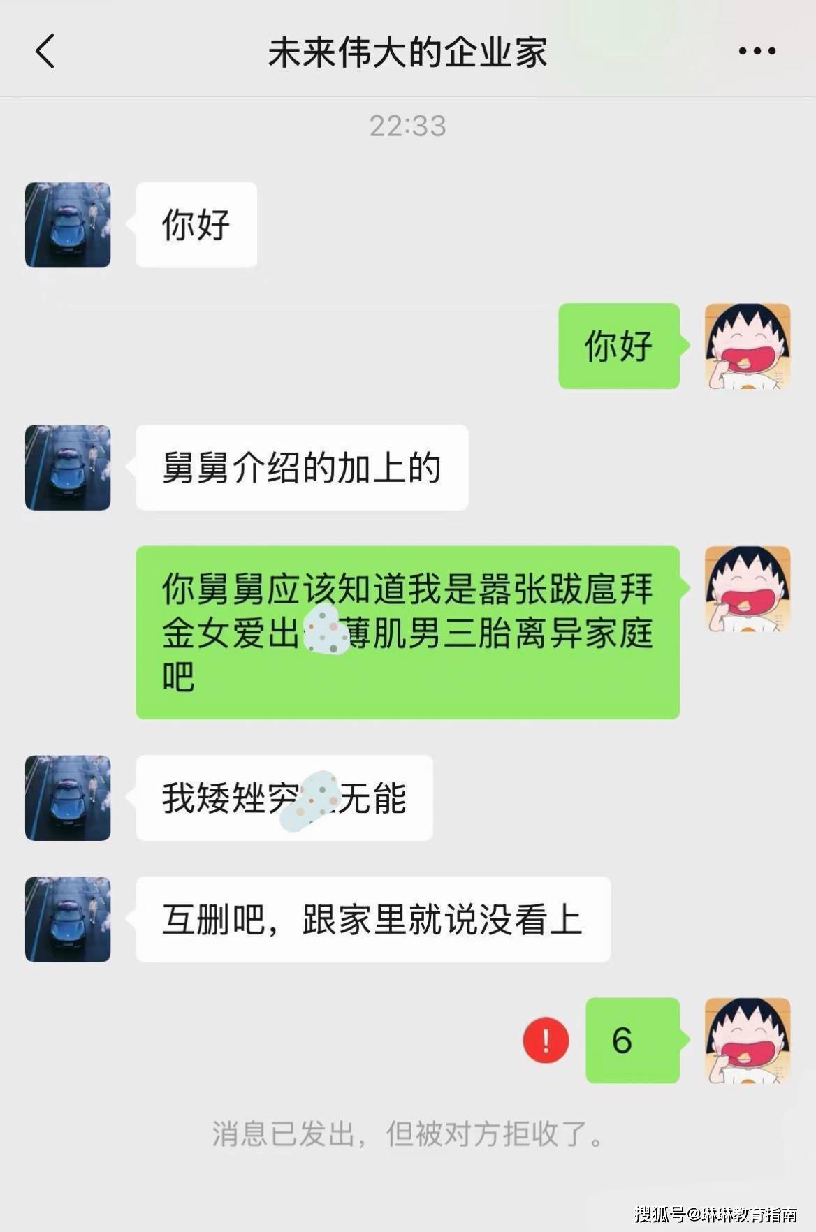 面对家长为自己精挑细选的优质男性,00后的女大学生也是毫不留情,当对方明确表示“自己不会聊天”,并且抛出了“你是女生吗?”面对这个明知故问的问题后,00后女大学生当即回怼:“不是女生,是畜生”。