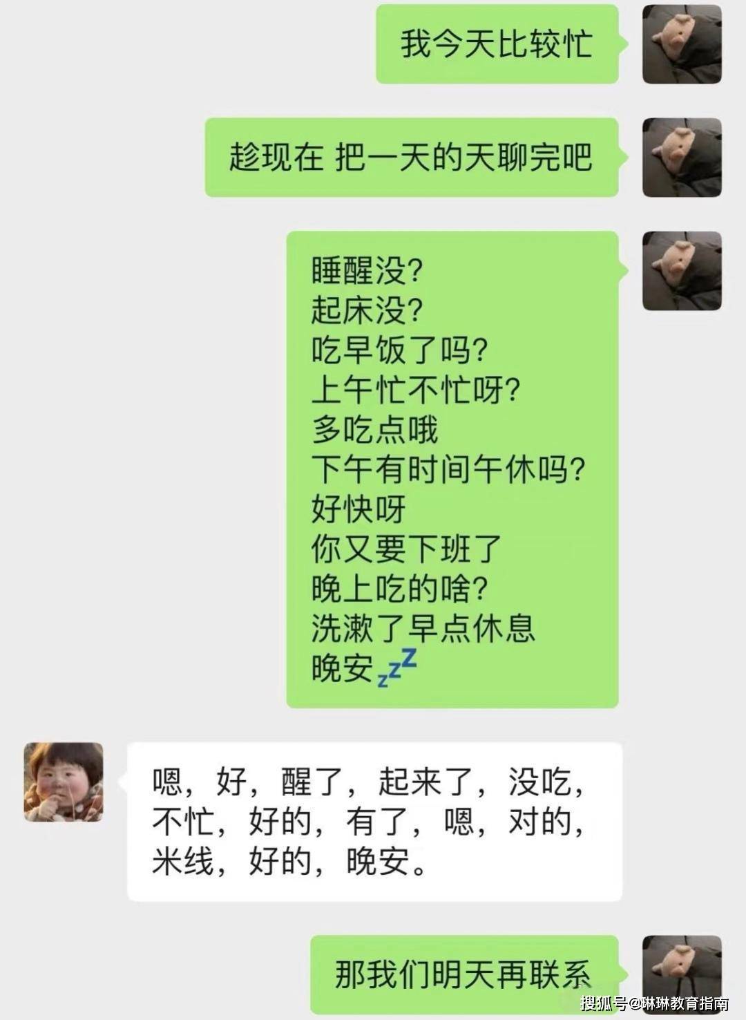 而这对00后毕业生更是如此,已经忙到没有时间聊天了,只能用这种敷衍的方式把一整天的问候全部聊完,所以说家里有00后孩子的家长们,与其着急,不如跟孩子们一点时间,等他们在职场中站稳脚跟,再去探讨人生大事。