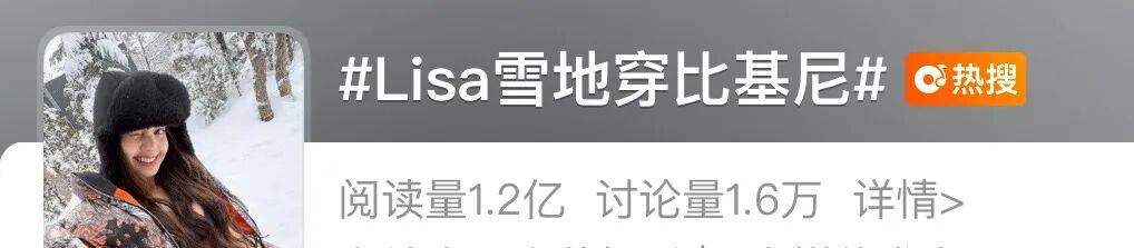紧随其后,Lisa发布了一组在严寒雪地中身着比基尼搭配NOCTA x Nike x Chrome Hearts三方联名羽绒服的照片,以强烈的反差感横扫中、泰、韩、印尼等多国热搜。截至2月9日,#Lisa雪地穿比基尼# 的微博话题阅读量已突破1.2亿次。