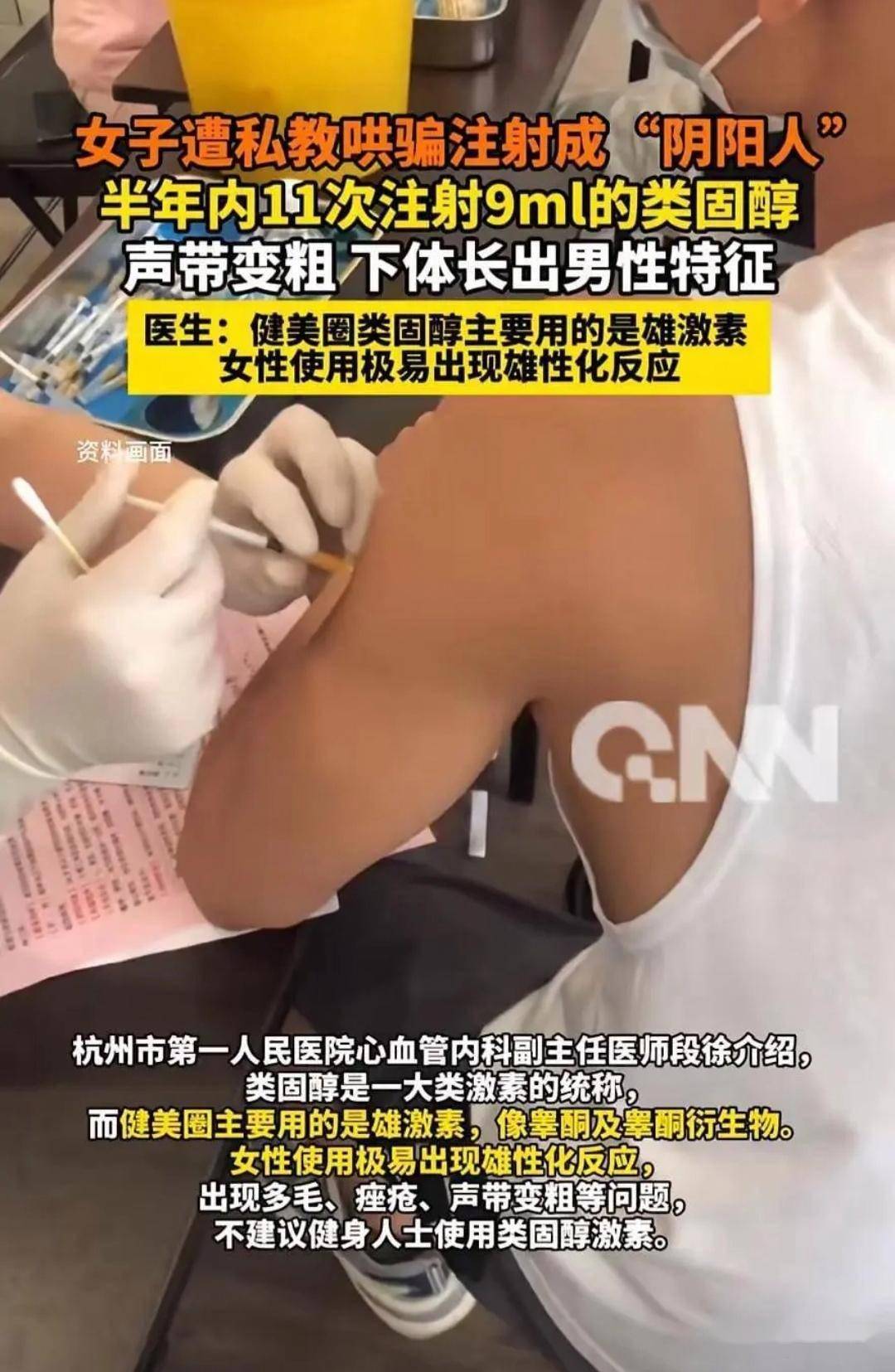 近日据媒体报道,杭州一网友备赛健身,竟被教练多次哄骗注射类固醇,11次共打9毫升,身体彻底异变:声音变粗、喉结突出,下体长出男性特征“肉芽”,不可逆伤害令人揪心。
