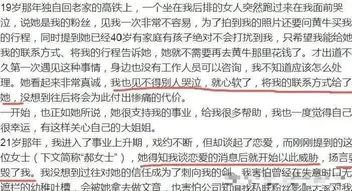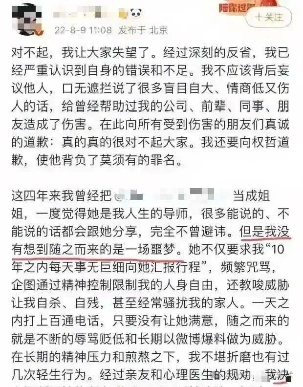 最近刷到一则新闻,震惊三观,也看得人脊背发凉。26岁的男艺人小丁,突然发长文自曝与一位富婆粉丝郝女士长达数年的畸形纠葛。文中“她逼我结扎,我吞了半瓶安眠药”的描述,字字惊心,令人窒息。这场始于高铁邂逅、曾被外人视作“缘分”的姐弟情,究竟是如何一步步演变成充满控制、辱骂与恐惧的噩梦?今天,浪妈就带大家一起走进这起事件背后,那些令人不寒而栗的真相。......................................................................01......................................................................这件事持续了六年,比电视剧还要复杂,故事从2019年的一趟高铁开始,那时19岁的小丁,在高铁上遇到了自称被黄牛坑骗的女粉丝(郝女士)。看着对方红着眼眶哭诉的模样心生恻隐,顺手添加了对方微信。他以为这只是一次普通的粉丝偶遇,是姐姐对偶像的善意支持,却没料到,这个举动会将自己拖进长达6年的“囚笼”。 起初的相处,处处透着“甜蜜”的假象。郝女士以“姐姐”自居,对小丁关怀备至,一件件奢侈品不断送到练习室; 她还凭借频繁支持的身份,获得了自由出入小丁经纪公司的特权,甚至以小丁的名义向他老家捐了一所希望小学。小丁也将这份好意记在心里,曾回赠价值8万元的礼物,郝女士后来转回4.5万元,两人以姐弟相称, 在外人看来是粉丝与偶像的良性互动,谁也没察觉这份关系里正在滋生的控制欲。 2020年,小丁悄悄开始了一段恋情,本以为是青春期里正常的情感萌发,却成了郝女士控制欲爆发的导火索。 郝女士发现恋情的那一刻,之前的温柔瞬间消失,取而代之的是近乎变态的管控规则。她给小丁定下了严苛到极致的要求:消息必须秒回,哪怕是凌晨三点的消息,也不能超过5分钟回复;每天早中晚要三次汇报行踪,不仅要说明“在哪、和谁、做什么”,还要拍实时定位和场景照片佐证;就连和女性工作人员的正常工作沟通,都要把聊天记录实时转发给她审核。 有一次,小丁因为拍摄广告进度滞后,忙到连喝水的时间都没有,晚了12分钟回复消息,就会被信息轰炸,语音条数高达78条。而且每条语音都充满了愤怒与贬低,像密集的炮弹一样砸向他。 那段时间,小丁的手机成了定时炸弹,他不敢调静音,连吃饭、拍戏间隙都要紧盯着屏幕,神经时刻紧绷,生怕错过一条消息就引发新一轮的辱骂。如果说消息轰炸是持续的精神折磨,那20岁生日当天的“礼物”,则成了压垮小丁的第一根稻草。 生日那天,郝女士约他见面,递给他一个包装精致的信封。小丁以为是生日贺卡或祝福信,满心期待地打开,却惊讶的看到是一张私立医院的结扎手术预约单,预约日期就在一周后。面对他震惊到说不出话的模样,郝女士却轻描淡写地说:“做了这个手术,你就永远干净了,不会因为谈恋爱影响事业,也能一直留在我身边,这是我给你的成人礼。”这句话像一把冰冷的刀,刺穿了小丁最后的防线。 他明确拒绝了结扎要求,强调自己的身体应由自己做主。可郝女士当场变了脸色,直接放出狠话说要把他早年没出道时的照片、吐槽同事的聊天记录全曝光,让他彻底在娱乐圈混不下去。一边是事业尽毁的威胁,一边是对身体自主权的剥夺,绝望的小丁在当晚回到宿舍后,吞下半瓶安眠药。幸好室友发现他状态不对,及时将他送往医院洗胃,才保住了性命。 可他没想到,郝女士的控制连医院都没放过。在他虚弱地躺在病床上、意识还模糊的时候,郝女士趁他不注意,用他的手指解开了手机指纹锁,翻遍了他的微信、微博、相册,甚至是通话记录,确认他没有和其他异性联系后才罢休。这次查岗像让小丁意识到,自己连生病的间隙都逃不出对方的掌控,这场噩梦根本没有尽头。如果说控制欲是无形的枷锁,那郝女士在聊天记录里的辱骂,就是直接刺向小丁尊严的利刃。 在双方后来曝光的聊天记录中,郝女士对小丁的称呼充满了贬低与侮辱。“鸭”“傻x东西”“生殖器廉价”,这些不堪入目的词汇,几乎成了她每次发消息时的前缀。 每当小丁提及与女性工作人员的正常接触,或是拒绝她的无理要求时,这些侮辱性的话语就会像潮水一样涌来。有一次,小丁在朋友圈发了一张与剧组女演员的工作合影,配文“合作愉快”。 郝女士看到这条朋友圈后,立刻发来几十条消息,内容都是指责他忘了自己的身份、不该和其他女性拍照,还贬低他是“靠女人的廉价东西”,称只有自己愿意为他花钱、找资源。她还逼着小丁删掉朋友圈,甚至让他给女演员发消息划清界限,否则就“去剧组闹,让你拍不了戏”。 更过分的是,郝女士会定期检查他的社交软件关注列表,一旦发现陌生女性账号,就逼迫他删除,同时追问他关注对方的原因,怀疑他有私下接触的意图。 在她眼里,小丁根本不是能自己做主的人,而是她花了钱就该归她管的专属东西。小丁的时间、社交、身体,都该由她支配,一旦有任何反抗,就是“忘恩负义”“背叛”。这种扭曲的认知,让小丁在日复一日的辱骂中逐渐失去自我,连和人正常说话都变得小心翼翼,生怕哪句话、哪个举动就触发对方的怒火。......................................................................02......................................................................2022年,郝女士对小丁彻底失去耐心,率先撕破脸。 她在网上曝光了小丁的手写信和一段录音,录音里小丁带着哭腔说“你是我唯一的姐”,瞬间引发全网嘲讽。紧接着,“小丁塌房”
