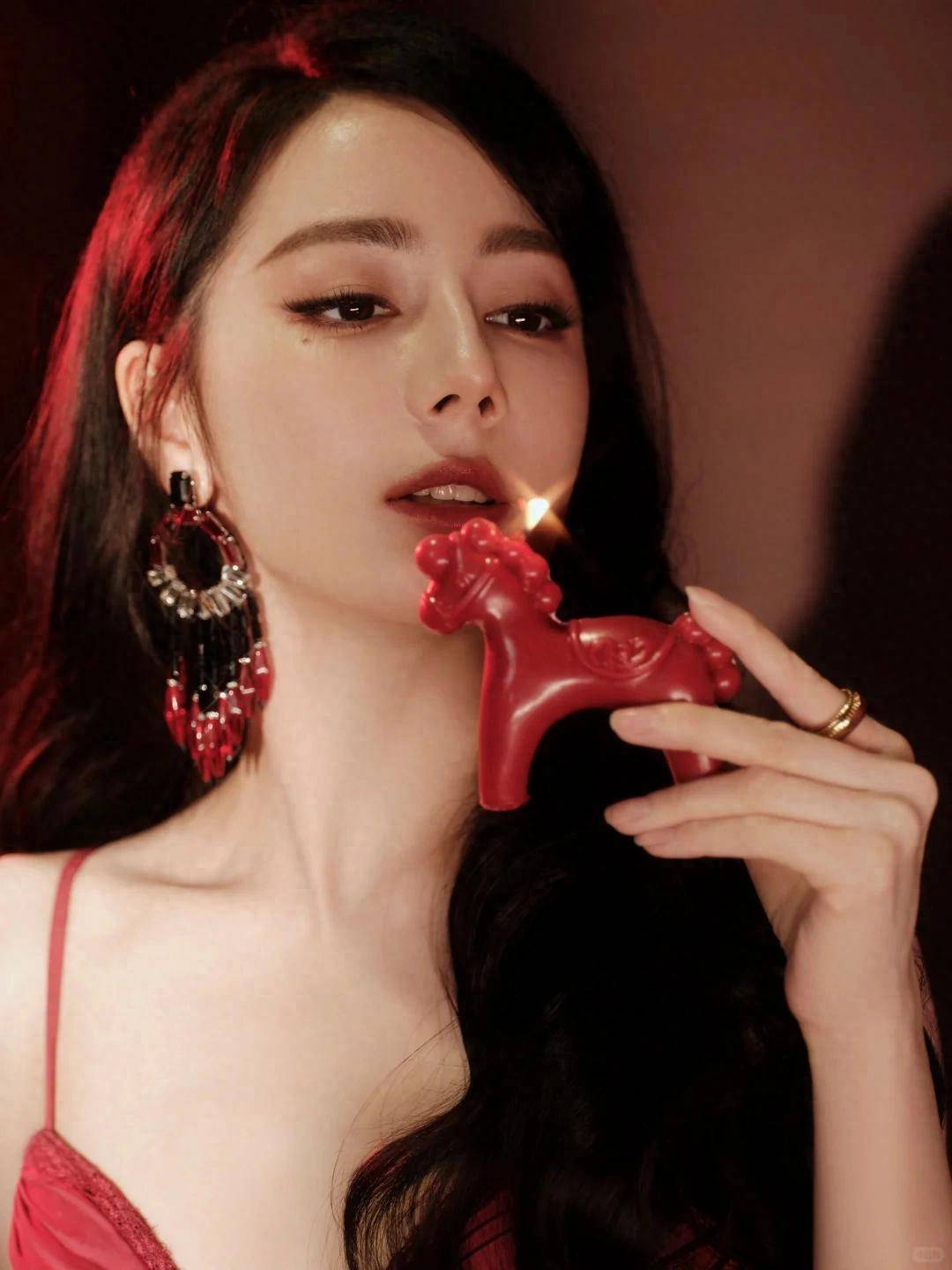 此次迪丽热巴把着重的展示点放在了妩媚成熟的女人味身上,一头港风大波浪,搭配上吊带裹胸收腰大红裙,再搭配上高开衩裁剪,更是看起来性感迷人,复古高跟鞋修饰了身材线条,