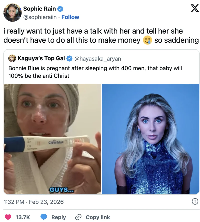 邦妮Bonnie Blue,英国知名成人模特网红,这几天在油管频道上发布了一个重磅消息:她怀孕了!而且孩子生父肯定是本月她组织的“400人繁育任务”中的参与者!消息一出,评论区哗然…邦妮今年26岁,以其极限的X爱视频挑战和争议言论而在成人网红圈快速出名。她最知名的记录据称是去年1月在12小时内和1057名男性发生关系。 就在本月,她又发起了一项涉及400名年轻男性的挑战,而她设置这次挑战的目的是为了让自己怀孕… 如何让自己怀孕呢?邦妮舍弃了安全套,和大家直接亲密接触。本月22号,她发布了一个vlog视频,讲述了自己的一周生活,期间,她通过验孕棒和腹部B超证明自己实现心愿,成功怀孕。 她放话由于活动时早已采集400名参与者的DNA和联系方式,等胎儿大一些后她会利用DNA技术找到孩子的亲生父亲,还会将“寻亲”过程全部记录成视频发在网上… 英国男同网红Jak White在看到邦妮的视频后主动联系媒体,自曝自己就是参与者之一。他谈到邦妮的怀孕给他带来不小的心理冲击:“虽然在经济上能够应付,且若真的中奖也会负起责任与邦妮共同抚养,但想到人生节奏可能因此产生翻天覆地的变化,还是让我觉得这一切发展得令人心惊胆颤。” 不过这个担忧不该是参加活动的时候就该想到的么?伴随邦妮宣布怀孕,她也被大骂“不负责任”:“妈妈,我的亲生爸爸是谁?为什么学校的孩子们总是嘲笑我?” 邦妮的怀孕还引起了“同行”的叹惋。美国知名成人模特苏菲在社交媒体上公然表示邦妮已经太迷失(苏菲主要是发布性感照片,并以处女身份作为卖点):“我真的想和她聊聊然后告诉她其实她根本不需要做这些来赚钱😢真是悲伤” 不说不知道,在成为极端成人网红前,邦妮曾过着一段看起来正常且幸福的生活。邦妮本名Tia Billinger,曾在英国NHS从事财务招聘工作。她当时外表甜美,还有一个处了很多年的青梅竹马Ollie Davidson,两人从学校最终走进婚姻,4年前,两人一起搬到了阳光明媚的澳大利亚生活。 但2年前,邦妮剑走偏锋,开始立志成为一名有名有钱的成人网红。如今成人行业已经是红海,她思索要如何才能让过目即忘的互联网大众记住她。她先去去改造了自己的面部外观,让自己看起来更“姐系”。 随后,她开始在网上公开招募想要和她发生关系的年轻男性,表示自己不收费,但他们得同意她把视频放到网上让自己的付费粉丝观看。如果他们介意自己被人认出,可以佩戴滑雪头套或者眼罩来保护身份。 她经常分享自己的实时位置,还在网上配文“我在伦敦,仰面躺着,想要你们!”而很多性虫上脑的男性都踊跃报名,这大量的视频为邦妮带来了不少的网上关注和流量。 但这些做法在她看来还没有足够“创新”,她要的也不是一个中大型网红的头衔,而是一个让人一眼就能知道她是谁,能为她带来无限关注和利益的举动。于是,1年前,她开始推出千人挑战,来打破所谓的世界纪录。 由于邦妮的挑战活动违法了她常驻平台的内容政策,她被永久封了号,但她知道自己的市场正在前所未有地开阔,于是转战了其他平台。并继续推出极端挑战内容。英国第四频道关注了邦妮的极端争议活动,播放了关于她的纪录片《1000个男人和我:邦妮布鲁的故事》,引发了全网关于女性剥削、平台算法和性积极女性主义的大量讨论。 很多人认为她是父权制的受害者,也有人说她是女性中的叛徒,还有人说她压根就是个捕猎年轻男性的捕食者。但她都否认了这些说法,还说自己没有恋父情结,从小到大的成长经历及过往工作经历都没有给她造成任何心理创伤。 2个多月前,她在全球旅游胜地巴厘岛准备拍摄点工作视频,但被偏向保守的印尼官方打断了内容创作。她当即因为涉嫌制作色情内容和违反交通规则被捕,最终因违反旅游签证规定而被驱逐,被禁止进入印尼10年。但她没有因此消停,又准备在曾经生活过的澳大利亚“玩个大的”… 除了行为非常争议,邦妮的言论也让很多人感到愤怒和担忧。她在直播中公然表示“没必要上大学”,炫耀自己19岁就开上了奔驰C级车,不久后就又买了房子。对于那些对她表达担忧和不齿的女性粉丝,她会直接挖苦和嘲讽对方,“他们喜欢……他们知道我做了他们妻子/女友本该做的事。” “记住,如果一个女孩说她来月经了,那她的嗓子肯定没问题。”还挑衅说让这些女性将男友/丈夫介绍过来,她会让他们的内衣闻起来“更香”。总之,非常公然挑衅一切批评者… 值得一提是,去年邦妮的青梅竹马丈夫和她离婚了,不过对方公然表示离婚原因并非邦妮的职业和极端挑战。但邦妮如今似乎很满意自己繁忙工作,下班后在自己宽敞家中得到两猫一狗陪伴的生活。只是不确定她为什么如今这么想要孩子,还是要通过这样争议的方式,根本不在乎孩子长大后得知实情的感受。 很多网友怒批她和400名参与者又蠢又下流:“和400个男人无保护措施后怀孕?所有参与者也都愚蠢下流至极。” 但也有眼尖网友指出,给她做B超的医生的同款滑雪头套,以及她刚怀孕就能在B超上看到胎儿这些迹象说明,这又是一场公关营销点击率噱头: “以下是我不相信这件事的原因……感谢另一位评论者让我想起了自己的怀孕经历……1)她做的是腹部超声,而不是阴道超声,阴道超声在孕早期效果最好。2)医生说胎儿大小相当于两周,但你得先停经,也就是大约5-6周后才能看到像米粒大小的胚胎。