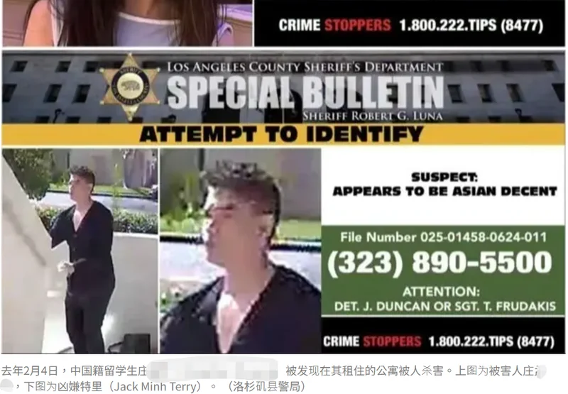 2025年2月4日,中国籍女留学生庄某被发现在其租住的公寓被人杀害。警方数日后逮捕22岁亚裔嫌犯特里(Jack Minh Terry),他被控谋杀罪。近日,本案进入初步听审会(preliminary hearing),检方须向法官证明,已掌握足够证据,可将本案推进到审理阶段。而随着检方邀请三位关键证人作证并列出多项证据,庄某被谋害细节也浮出水面。房东:庄女带凶嫌进卧室根据本报从洛杉矶高等法院取得的资料,检方其中一位证人,是庄的室友及房东M先生(为保护隐私化名)。庄被发现死亡的前一晚,即去年2月3日约11时30分,M先生正在客厅的沙发上看电视,他看到庄带着被告特里进入她的卧室。第二天凌晨约2时30分,M先生起来上厕所时,听到庄的卧室有嬉笑聊天声音。M先生第二天照常出门上班。中午当他与同事一起去吃饭时,连接手机的监视器软体提示,监测到家门口有活动。当他查看影响时,发现一男子从庄的二层卧室窗户跳出;该男子先是扔下两个包,再自己跳下,回望窗户和门,接着走出监控视野。 M先生当下没有起疑心,他发信息给庄:「你可以邀请别人来过夜,这跟你自己的房子一样,你付房租。但我不想你吓到邻居。」然而他的手机显示,这条信息一直未被读取。当天下午约6时40分,M先生下班回家。他第一眼注意到,那个窗户仍是大开,并且原本的一层纱窗不见了。他走进屋内,试图从打开的窗户向卧室张望,这时,他似乎听到了风扇的声音。 M先生知道庄有一个风扇,他给庄打电话,未接通且直接转入语音信箱。 M先生试图打开庄的卧室门,但上了锁。 M先生拿了一只勺子,转开了房门锁,走了进去。 M先生起初没有在卧室看到庄,他说,房间没有亮灯,感觉卧室的一切都很整洁。这时他意识到,之前听到的声音并非来自电风扇,而是水流。他顺着走廊往浴室方向走,他先是快速朝步入式衣柜看了一眼,确保没有人,之后他朝浴室走去,看见洗手池的水管没有关,浴室的门半掩,里面有亮光,他推开门,眼前的一幕让他发出惊呼声。 透着浴缸的毛玻璃门,他看见庄的一条腿和黑色的被子。 M先生立刻拨打911报警。当时不仅水池的水是开着的,浴缸上方的淋浴喷头也开着水。 死于钝器伤现场留血迹检方的证人、女警探弗达克斯(Tera Frudakis)在庭上讲述更详细的庄被发现时的场景。庄朝向左侧躺在浴缸中,头部低垂。上半身盖着一条黑色毯子,半遮蔽头部。她身上还盖着一件棉夹克衫。脚部有一个枕头,有其他物品围绕在她身边。所有物品都被浸湿。手腕上缠绕一条充电线。 在被害人的身子下面,有部分破碎的台灯。该警探说,台灯的下半部分是陶瓷制成,非常坚硬。根据庄的验尸报告,她的前额有多处钝器伤,颈部有刺伤,后颈以及肩膀、腿部有伤口。报告显示,被害者体内没有发现酒精或药物。结论为钝器伤致死,判定为被谋杀。此外,死者身体上多处发现被告特里的DNA。在案发浴室墙上、门把手以及卧室均发现血迹,被证实是或混有被告的DNA。 男嫌车上有被害人财物警探弗达克斯讲述了对庄的社交帐号的调查过程。她说,庄与特里2025年1月13日通过Hinge(约会APP)相识,后来互加Instagram聊天。案发前一天即2月3日,两人通过Instagram沟通相见地点。庄将地址发给特里。特里开一辆红色Toyota Corolla轿车从学校接到庄,之后两人驱车来到庄的住处。 警方后来对特里的这辆红色轿车进行搜查,发现关键证据。警探在其车内发现一个绿色JanSport品牌背包以及一个装有相机的黑色相机包。此外还发现一个灰色钱包,属于庄的,里面有她的身分证等个人物品。警探还发现一个手机,属于被告。一个印有花的手机壳,属于庄某。作证警探弗达克斯表示,属于被害人的物品,均获得庄的家人证实。 警方在搜查特里卧室过程中,发现了一件V领黑色开衫以及一条黑色裤子,与其在被害人住所监控中所著的衣服相似。 此外,特里在2月16日被捕后,警探发现他左手手指之间的连接处有伤痕,已经处于愈合阶段。经过调查,特里与好友P女士发过的信息中,曾提到这个伤口。对话中,P女士发信息:「兄弟,天哪,她怎么回事?」特里说:「我能说什么呢?我吸引到了最好的女人。」 前女友举报嫌犯终落网同一天的庭审中,特里的前女友C女士出庭作证。她与被告曾有一年半至两年的情侣关系。两人在2024年分手。 2025年2月案发后,C女士母亲发信息给她,那是一张由洛杉矶县警局发出的通缉令。母亲半开玩笑说,「这难道看着不像他吗?」C女士一看通缉令上的照片,立刻认出特里,并拨打通缉令上的警方电话。 C女士在庭上作证,她与特里相识于河滨加大(UCR),两人的关系并不愉快。她说,「我很害怕,害怕特里会伤害我。」她说,两人在发生性关系过程中,特里有时粗暴,不顾及她的感受,事后还会得意的笑。 C女士表示,特里经常在性关系发生时掐她的脖子,在日常亲密时也会掐她脖子。 庄的家人到场聆听了审前听证会,检方介绍,庄的家人是为了想要知道到底发生了什么。其家人曾帮助警方指认受害人遗物,目前检方尚未有计画将他们包含在证人之列。法官同意了检方的请求,让受害人家人在场聆听了审讯。