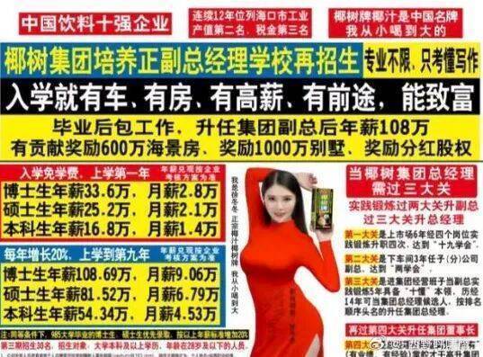 2021 年,椰树的招聘广告又翻车了,直接写着“入学就有车、有房、有高薪、肯定有美女帅哥追”,因为违背公序良俗,又被罚了 40 万。