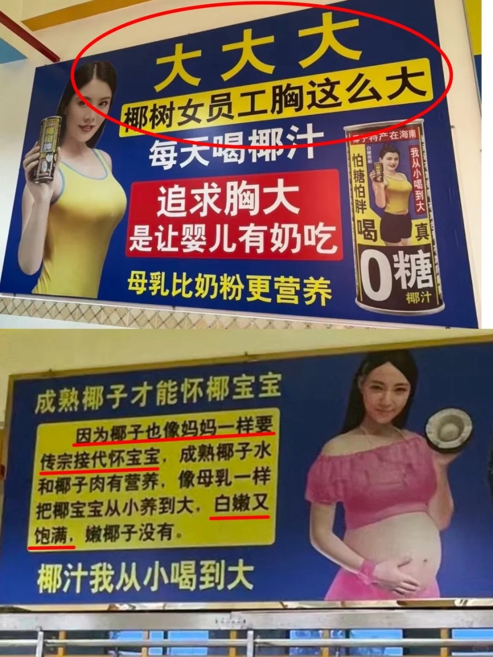 居然把女员工的身材当广告词,直接在工厂里挂出“大大大”“椰树女员工胸这么大”的标语,甚至还扯出“追求胸大是让婴儿有奶吃”的说法,看完我真的满脸问号。