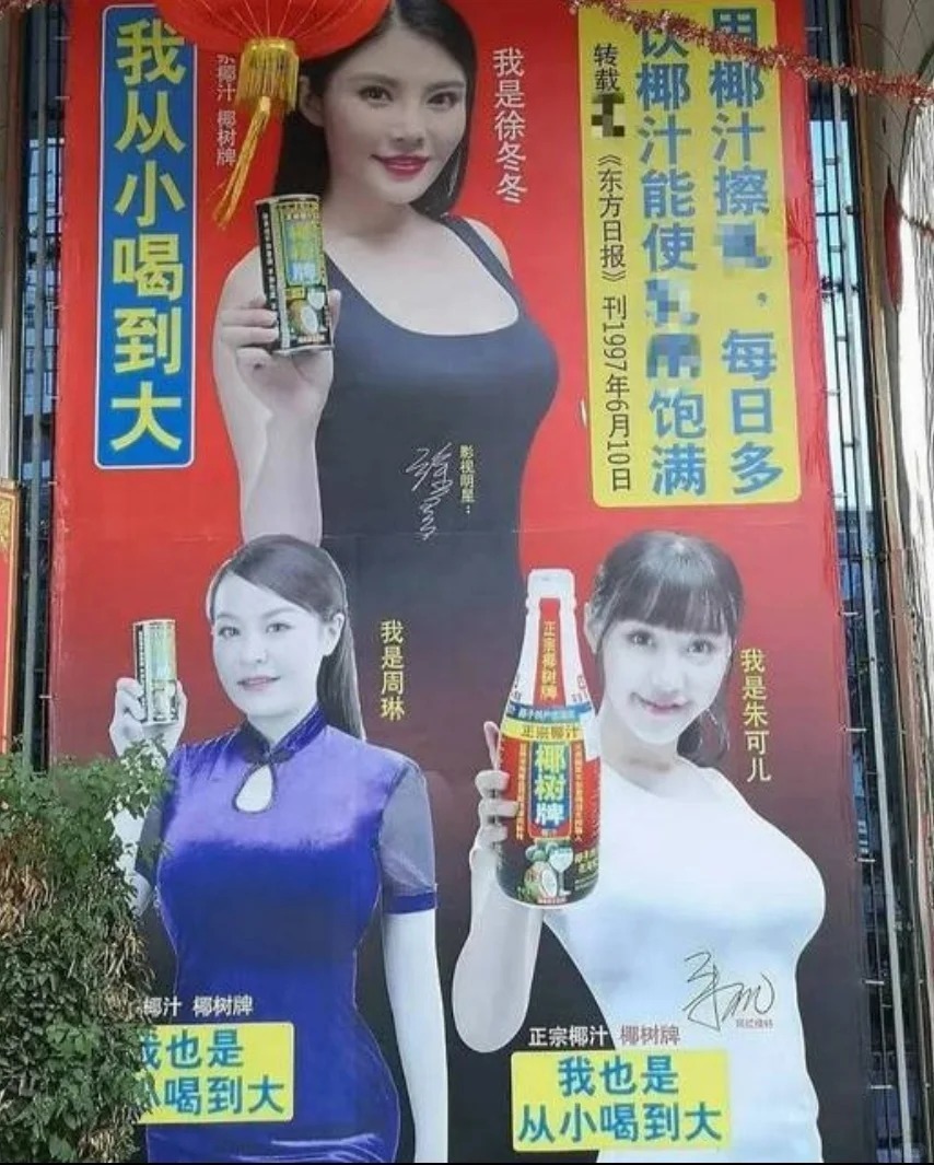 最早让椰树擦边出圈的,应该是 2019 年大家都听过的那句“我从小喝到大”。当时这句广告语配着身材丰满的代言人,被网友质疑暗示喝椰汁能丰胸,最后被罚款 20 万。