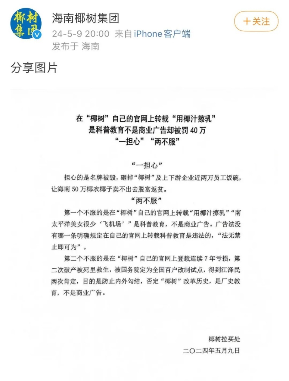 最夸张的是 2024 年,椰树在官网上发了“用椰子擦乳”“南太平洋美女很少‘飞机场’”的广告语,被罚 40 万之后,居然还发布声明“不服”,说自己这是科普教育,还打苦情牌,说担心被罚搞垮企业,让两万员工失业、50 万椰农卖不出椰子。