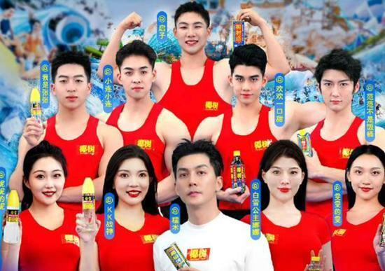 比如推出“胸模瓶”矿泉水,找胸模冠军代言;直播间一会儿让穿着清凉的女主播跳舞,被举报后,就换成肌肉猛男,甚至老大爷,主打一个男女通吃的低俗擦边;包装更是几十年如一日的土味密集排版,搭配各种夸张的标语,怎么博眼球怎么来。