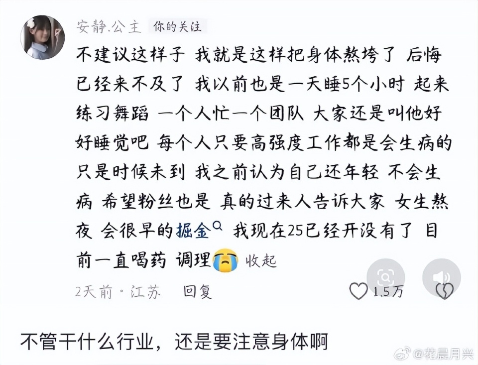 “身体垮了是一辈子的事。”她在直播中向粉丝,尤其是女性群体发出沉重呼吁,强调必须优先保证睡眠和规律饮食。这番自曝迅速引发海量共鸣,评论区成了“病友”分享会:“25岁停经”、“长期熬夜确诊卵巢早衰”等案例层出不穷,一场关于年轻人健康“债务”的集体反思被瞬间点燃。