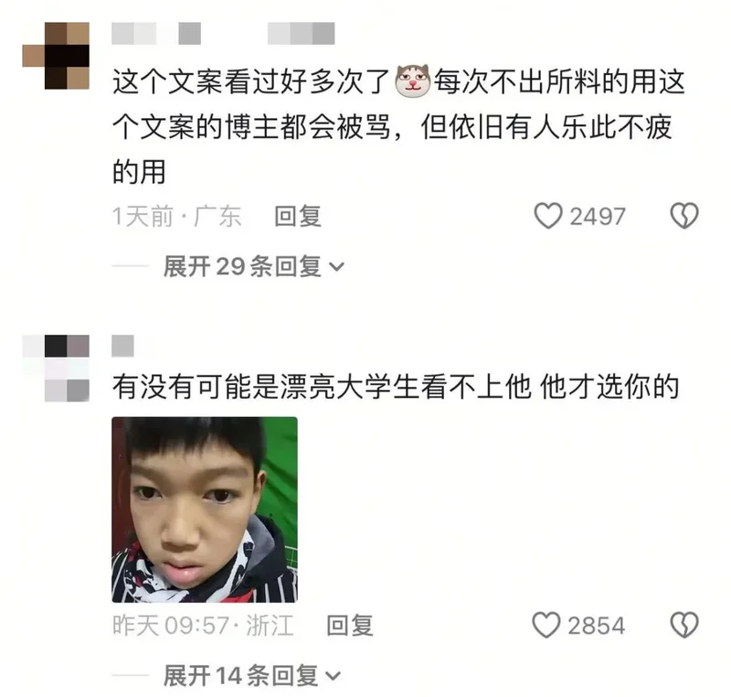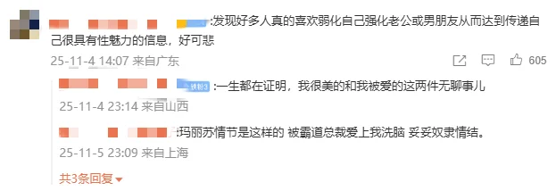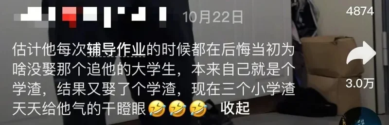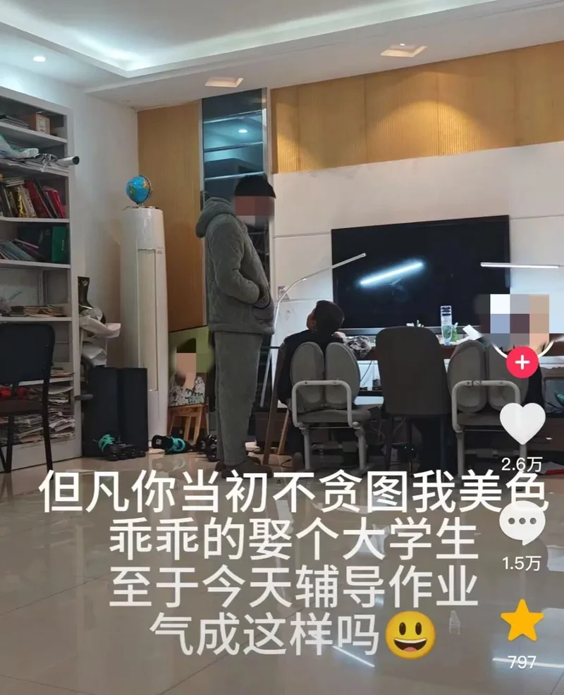 不知道你刷到过这种视频没:爸爸辅导作业气得拍桌子,妈妈拍的视频却配着这样的文案:“都怪你贪图我美色,不娶个大学生,现在被娃气着了吧?”表面是自嘲,语气却透着股藏不住的得意。更怪的是,这类自我贬低式炫耀正在短视频平台成批出现,形成了一套固定剧本:女方自称“学渣”“小二本”,男方必须是985精英,情节永远是“他放弃优秀对象偏选我”。今天,咱们就一起扒一扒,这套嗲妻剧本背后到底藏着多少离谱的瓜。.............................................................01..............................................................打开短视频平台,“嗲妻文案”的模板化程度令人咋舌,仿佛出自同一个流水线。所有文案都严格遵循“强调老公优秀+自我贬低+结局反转”的三段式结构,角色设定更是固定为“精英男+傻白甜”的强反差组合,靠着这种戏剧化冲突收割流量。 老公必然是“985毕业”“工作体面”“年薪百万”,身边环绕的追求者不是医生、护士就是公务员、教师;而博主自己则必定是“河南小二本”“初中没毕业”“农村学渣”,标签化地将自己定义为“除了生孩子啥也不会”的无用之人。 最核心的反转环节,往往是“他放着门当户对的高知不娶,偏要娶我这个学渣”,字里行间都在炫耀自己的性魅力凌驾于学识之上。有博主写道:“我老公985学校毕业,相亲第一次见面就跟我聊线性分析、高代、统计学,我一个小二本根本插不上话,可他婚后却说,没想到你懂得还不少,是个有趣的人。” 还有人更直白:“公婆当初就想让儿子找个大学生,结果他非要娶我这个农村学渣,差点没把他们气吐血,现在还不是对我疼爱有加。” 这些视频的场景也高度雷同: 要么是老公辅导作业气到干瞪眼,要么是老公向朋友诉苦“找媳妇得要毕业证”,博主则以胜利者的姿态现身说法,将这种看似吃亏的选择,包装成自己被偏爱的证明。 更有甚者,将生活中的无理取闹也当成炫耀资本:在高铁上看到对面情侣吃薯片,非要让老公立刻去买,老公说下车再买就撒泼打滚, 直到老公厚着脸皮向陌生人要到薯片才罢休,转头就发视频炫耀“他为了我什么都愿意做”。“被老公养着,不让我上班”更是高频主题。 博主们带着得意的语气写道:“他说我赚那三两千够干嘛?不如在家玩,就算穷死也不让我去上班”“婚后他去哪都要带上我,他上班我在车里呆一天,就差把我拴裤腰上了”, 甚至有人炫耀“在家属院里,他一出去上班就把我锁家里”,将失去自由的囚禁,硬生生解读为“被宠爱的证据”,让人看得脊背发凉。 为了凸显自己受宠、老公厉害,这些博主不仅极致贬低自己,还毫不留情地拉踩大学生群体,将高学历女性当成自己的对照组。“老公同事娶的不是医生就是护士要么就是同行,唯独他娶了一个初中都没毕业的学渣” “谁让你当初放着好好的门当户对的老师公务员不要,非要娶我这个学渣,现在好了,基因强大生了个小学渣”, 这类文案里,大学生、高知女性成了“无趣”“古板”的代名词,而自己则靠着“美色”“懂事”胜出,暗戳戳地传递着读书无用论。更令人不适的是,有些博主甚至将婚姻中的伤害也美化成宠爱。有网友分享:“我表姐催老公洗澡被打了,第二天老公给她热了俩包子蒸了仨鸡蛋,她就感动得发圈说睡到自然醒,睁眼就有饭吃,实际上眼睛肿到睁不开请了病假。” 这种从屎里找糖吃的行为,本质上是将自我价值完全依附于男性的认可,哪怕这份认可带着伤害,也甘之如饴。.............................................................02..............................................................这场“嗲妻文学”的歪风,还吹出了好几个让人瞠目结舌的变种。之前有个文旅局的工作人员,在网上炫耀自己“老公是市里副处”,孕期请假把活儿都推给同事,结果惨遭打脸。 她老公根本不是副处,自己也因为吹牛散布谣言挨了处分。这就是把体制身份当勋章,幻想靠男人拥有特权,骨子里还是“我男人厉害所以我高贵”那套逻辑。 更离谱的,是像一位博主那样,把自我矮化玩成了自我物化。 她管男友叫“主人”,发的内容全是“嘤嘤嘤”。想买键盘男友不给,哄两句她就觉得是恩赐;玩游戏花一百多被骂,男友提出睡觉抵账她竟觉得甜蜜;最毁三观的是,男友让她长期吃避孕药代替安全措施,她居然把这当成专属宠爱四处炫耀。 这已经不是撒娇,是彻底把自己当成了对方的私人宠物,还把伤害当成了荣誉。这股风气甚至蔓延到了职场,催生了所谓的“娇牛马文学”。有人在商务饭局上专点小孩吃的炼乳馒头、炸薯条,发朋友圈炫耀“领导把我当小孩宠”; 领导随口一句“小孩爱喝可乐你多喝点”,也能被她解读成特殊关照。网友吐槽得一针见血:“怪不得领的是宝宝工资,干的是巨婴活。” 在靠专业能力吃饭的地方,还想着靠装可爱博取好处,不仅显得极其不专业,最终也只会让所有人都看不起。.............................................................03..............................................................这些视频能火,说白了就是掌握了黑红也是红的流量密码。 网友骂得越凶,流量越高。不少博主直接承认:“这种内容好起号,数据漂亮”,还有人专门总结出“双非硕嫁985博”“常春藤学霸爱上初中辍学生”这种反差模板最惨的还是被误伤的学渣们。 评论区有人喊冤:“学渣招谁惹谁了?学习不好就得背这锅?”确实,成绩差不代表
