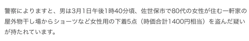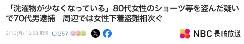 今天咱们聊个有点让人哭笑不得的新闻。事情是这样的,在長崎縣的佐世保市,最近发生了一连串让人摸不着头脑的盗窃案。不是偷钱,也不是偷珠宝,而是专偷女性内衣裤。搞得当地好多女性都人心惶惶,晒个衣服都得时刻盯着,生怕一转眼,自家晾衣绳上就少了几件“贴身宝贝”。其中,一位80多岁的老阿嬷更是成了“重灾区”。她发现,自己晾在外面的内衣裤,那是“越晒越少”,隔几天缺一个。老人家心里就犯嘀咕了:“这不对劲啊,感觉好像被偷了。”左思右想,还是决定报警,让警察来查查到底是谁在跟她这点“小布头”过不去。这一查可好,警方顺着线索,经过一番调查,最后把嫌疑人给逮住了。结果一公布,犯罪嫌疑人竟然是一名78岁的无业老翁! 没错,你没听错,是个快80岁的老爷子。这年纪,搁咱们这儿,跳广场舞都得是领舞的,结果人家倒好,不走寻常路,干起了这档子事儿。警察一询问,老爷子倒也干脆,一上来就承认:“没错,就是我干的。”这坦白的劲儿,也让警察很无语。据警方透露,事情发生在这个月1号下午1点40分左右,大白天的,这位78岁的老爷子就悄悄溜进了那位80岁老阿嬷的家里。目标非常明确,直奔室外的晾衣区,手脚麻利地偷走了5件女性内衣。算下来,总价值大概是1400日元,合人民币也就六十多块钱。 说实话,这老爷子要是干点别的,这年纪早该在家含饴弄孙、颐养天年了。可他偏偏选择了这么个“夕阳红”犯罪路线,让人不知道该说他“老当益壮”,还是该感叹一句“世风日下”啊。这事儿还没完。警方在接受采访的时候还透露了一个细节,说这老爷子被抓后,虽然承认了偷阿嬷家内衣的事儿,但周围地区之前也陆陆续续接到过好几起类似的报案,都是内衣裤被偷。所以,现在警方正在调查,这位78岁的“老手”到底是个“初犯”呢,还是说早就“纵横江湖”多年的惯犯。 这条新闻一出来,日本的网络评论区直接炸锅了。有网友直接开启吐槽模式:“80岁阿嬷的内衣,78岁大爷去偷……这俩人加起来都快160岁了,简直是犯罪界的‘夕阳红’组合啊! ”还有网友关注点很奇特:“等一下,5件内衣才1400日元?一件才280日元(约合人民币13块)?阿嬷的内衣也太便宜了吧……不过这不是重点,重点是大爷你这品味还真是‘朴实无华’。” 另一位网友则是一脸无奈:“看新闻说,大爷是‘潜入’阿嬷家中。说实话,78岁的‘潜入’,怎么听着更像是‘串门’呢?真是活久见,这么大年纪还要进局子,何苦呢?”无独有偶,就在长崎县这位“老前辈”落网的同时,隔壁长野县也曝出一起类似的“内衣盗窃案”,不过这次的作案者,画风又完全不同了。 长野县警方13号宣布,他们惩处了一名20多岁的年轻男警察,停职6个月。原因是什么?这哥们儿还在警察学校上学的时候,竟然潜入了女更衣室,偷了3件女同事的内衣!好家伙,未来的人民卫士,还没上岗呢,先学会了“顺手牵羊”。被抓之后,这位年轻的警察倒也坦白,说偷东西纯粹是“为了满足个人的欲望”。听听,这理由,跟那位78岁的老爷子简直是“异曲同工”,一个“就是我干的”,一个“满足欲望”,都是那么的“坦率”,坦率得让人不知道说啥好。 长野县警察局的局长后来还出来鞠躬道歉,说这种行为“有失警察的身份”,向全县人民表示深深的歉意。最后,不得不感叹一句,日本的治安,最近这是怎么了?从偷内衣的“夕阳红”大爷,到偷内衣的“预备役”警察,这要是拍成电视剧,编剧都得被骂“太离谱”。