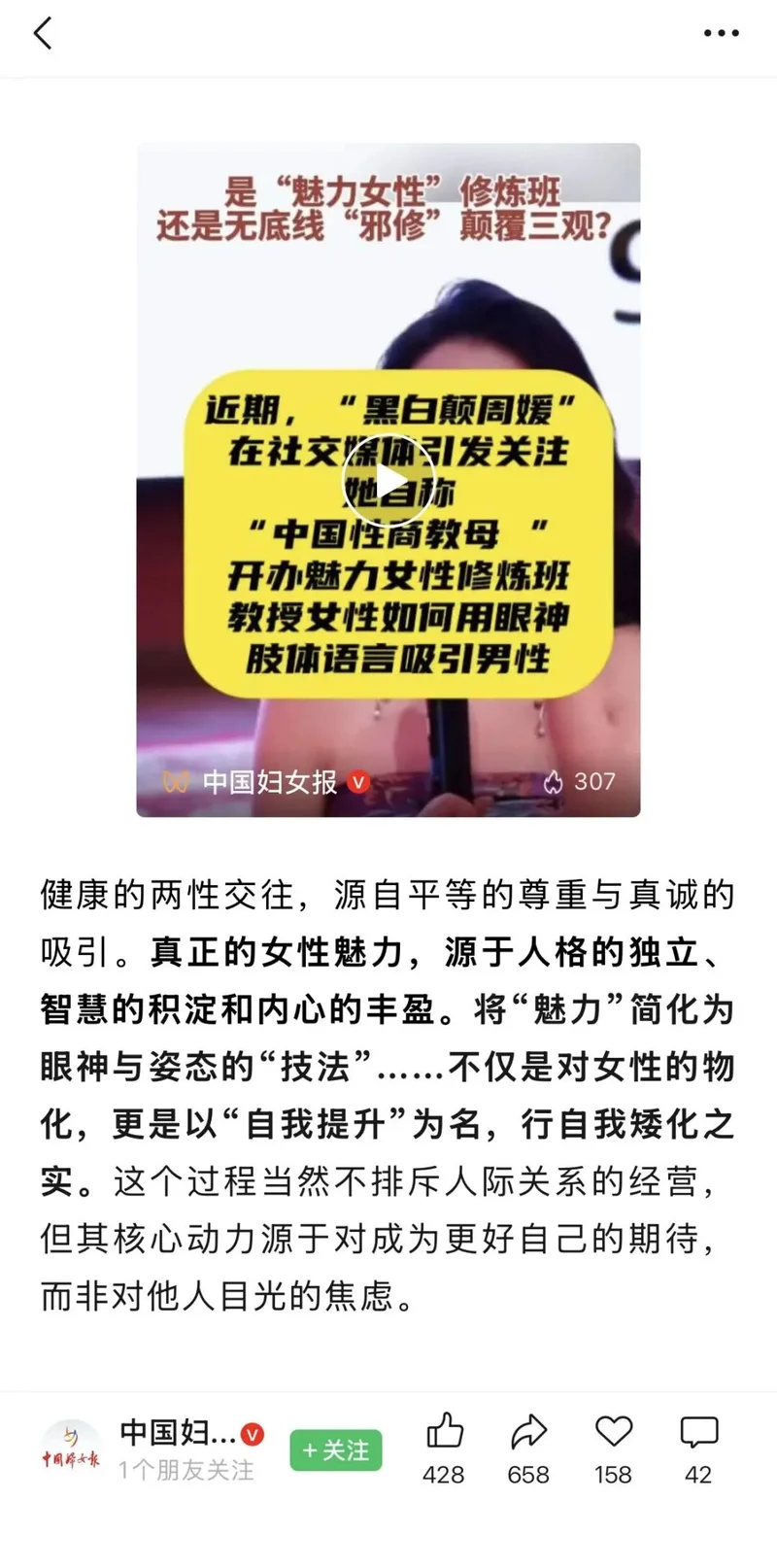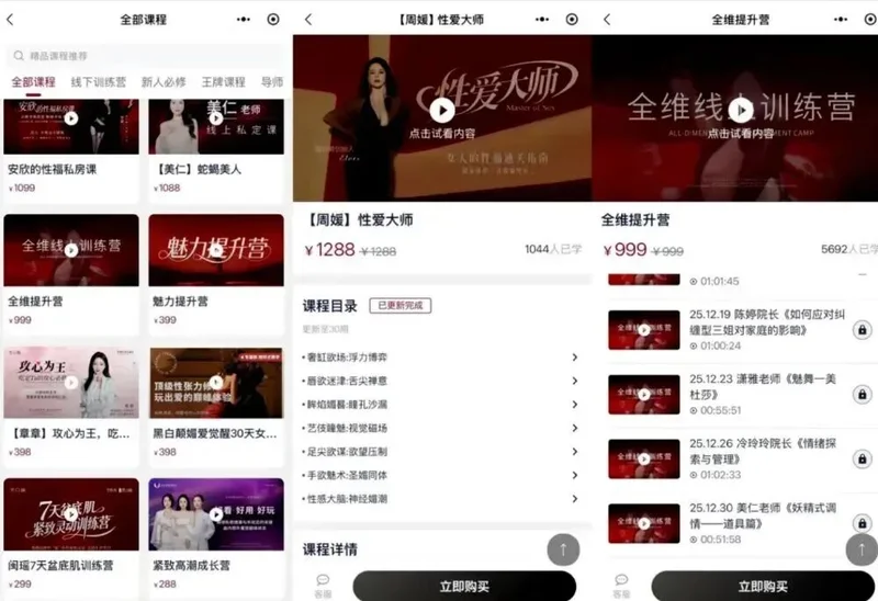 消失的网红,就像掉进马桶的手机——你以为它彻底报废了,结果人家擦擦干净,换个壳又开机了。两个月前,那位被封禁的“性商教母”周媛,最近换个马甲又杀回来了。但仔细一品,嗯,还是熟悉的配方,还是熟悉的味道。一夜封神?一夜封号!去年底,你的抖音可能也被这个女人“杀”过。视频里,她穿着紧身抹胸,身体扭成一道S型,眼神直射镜头,用一股子传销讲师般的激情喊出:“我的眼神给出去,和身体形成一个X型!” 就这15秒,魔性、荒诞、又带着点说不清的暧昧,瞬间引爆全网。相关播放量冲到3个亿,45天圈粉近20万。周媛,这位自称“中国第一性商教母”的奇女子,和她创办的“黑白颠性商学院”,就这样坐上了流量火箭。 她的“性商”生意经很简单:把“性”和“情商”粗暴嫁接,包装成一套让女性“魅力开光”的标准化动作。课程明码标价,从9块9的引流课,到8万8的“导师私教班”,丰俭由人。几年下来,上万人付费,据说营收超过了2400万。 这还没算她名下那几家医美公司、成人用品商城、情趣内衣店铺……一条从“洗脑”到“消费”的产业链,严丝合缝。而线下训练营的尺度,比网上流传的视频“炸裂”得多。有网友爆料,课程要求学员穿吊带小睡裙,用香蕉做道具; 图源:线下授课现场还设有性爱博物馆、BDSM房、感官房。 图源:小红书那阵子,她的线下课排得比明星演唱会还满,想去上课得靠抢。但互联网的梦,醒得也快。今年1月,她的账号一夜之间“灰飞烟灭”。抖音、小红书等平台齐动手,永久封禁。官媒下场点名,批评其内容“颠覆三观”“矮化女性”。更狠的是,长沙当地市监、公安等部门联合立案调查,她的2400万生意,仿佛一场喧闹的烟花,啪,没了。 换号不换药还是那个味儿这次复出,周媛学聪明了——至少看起来聪明了。3月8日和3月18日,她顶着新号“你好周大宝”悄悄开播,语气委屈,动作熟练,仿佛那场声势浩大的封杀只是一场“误会”。直播里她亲口承认自己就是周媛本人,把当初被封的原因轻描淡写成“太多黑子”,甚至略带委屈地说自己“无力发声”,一张嘴抵不过舆论众口一词。 图源:东方财经这话术,翻译过来就是:我没做错什么,是你们不懂我。直播间里有人问怎么买课,她立刻连线另一个账号,熟练地引导观众去那边下单。关联店铺“黑白颠性商学院”里,199元的《女人一生的必修课》和9.9元的《黑白颠礼仪气质》一度在售,虽然很快又下架了,但那个“引流—转私域—卖课”的流程,丝滑得让人心疼。 图源:黑白颠性商学院最绝的是,面对网友“课程是否有用”的质疑,她笃定回应:“每个对我没有偏见的女性,都应该来听我的课。”这逻辑闭环我给满分——你觉得我没用,是因为你对我有偏见。而那个让她“一战成名”的“眼神给出去”,也被她重新包装了。这一次,她说:很多女性不敢大方流露眼神,根源在于内心胆怯、害怕,压抑自身需求。眼神给出去,是勇敢、有魄力、内心笃定的表现。乍一听,好像还有点道理?但仔细一品,这不就是把同一套东西换个马甲重新端上来吗? 图源:东方财经以前是“勾引”,现在是“勇敢”;以前是“取悦男人”,现在是“取悦自己”。内核压根没变:女人的价值,依然要靠“能不能吸引异性” 来证明。没过几天,这个新号也被搜不到了,又一次“速通”封禁。但问题是,她真的就此收手了吗?答案大概率是:不会。因为这门生意,太挣钱了。 从Ayawawa到曲曲再到周媛“杀不死”的性商教母周媛不是第一个,也不会是最后一个。这些年,情感生意的赛道从来不缺“教母”。Ayawawa用“MV/PU”理论,把爱情拆解成一场精打细算的资源交换;曲曲大女人用“向上社交”“一切为我所用”,把亲密关系包装成阶级跃迁的跳板。 她们的套路,其实都差不多:第一招,制造焦虑。你的亲密关系出了问题,是因为你“魅力不够”“情商不高”“不会经营”。你不买课,就等着被甩吧。第二招,把复杂问题简单化,让你觉得只要学会了这些“术”,就能一招制敌,获得情或钱。 第三招,用“取悦自己”包装“取悦他人”。这是最讽刺的一点。比如,周媛的课程反复强调“女性成长”“自我绽放”,但仔细看内容——请丈夫递水要用“老公,方不方便帮你的小可爱一个忙”,喝完要给反馈“果然还是我老公最靠谱”。 这到底是“取悦自己”,还是训练自己成为一个更“好用”的伴侣?深圳技术大学有位学者做过田野调查,发现不少学员其实是在亲密关系受挫后,急需一套理论来解释自己的痛苦。这些课程提供了一种“秩序感”——只要我改了,一切就会好起来。这种心理,才是周媛们“野火烧不尽”的根本原因。她们不是在卖课,是在卖一个“可以重新掌控人生”的幻觉。 写在最后周媛复出、被封、再复出、再被封,这个循环还会持续多久?从监管层面看,1月30日长沙多部门已联合对其立案调查,责令停止全部经营活动。平台也迅速封禁了新号。但问题是,只要流量变现的通道没被彻底堵死,只要违规成本低于预期收益,就总有人愿意赌一把。而从社会层面看,周媛的“复活”之所以能引起关注,恰恰说明了一个尴尬的事实:正规的性教育和情感教育,缺位太久了。当一个社会“谈性色变”,当人们在亲密关系遇到问题时找不到靠谱的咨询渠道,就总有人愿意把周媛们的“邪修”当成救命稻草。 图源:中国妇女报有人问:那些买课的学员,到底在想什