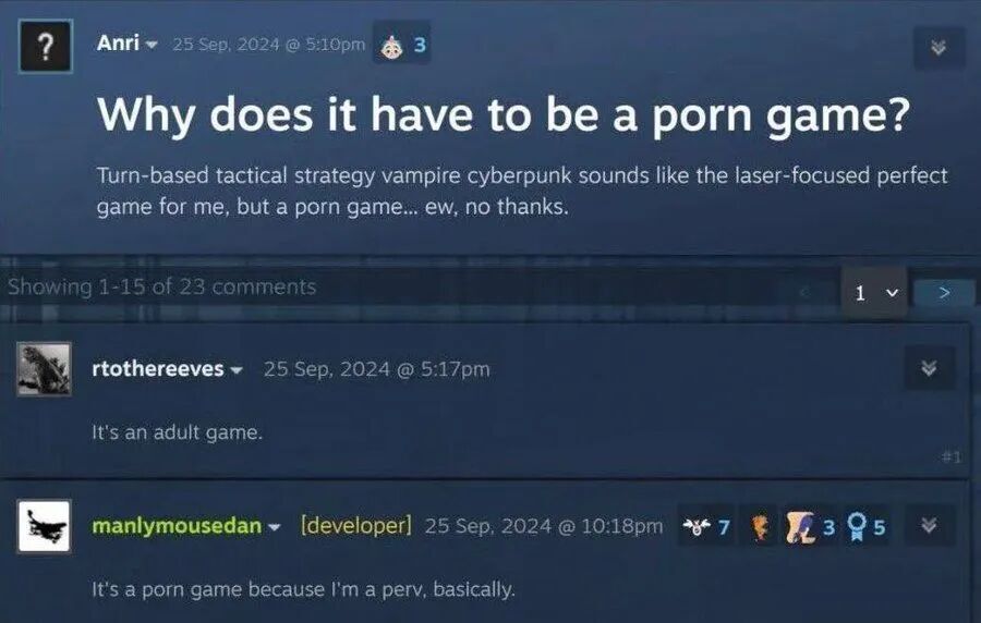 对此,开发者 manlymousedan 直接正面硬刚:“这款游戏之所以是色情游戏,是因为我就是个变态(I am a pervert)。”他进一步解释道,在充满暴力描写的媒体环境中,性元素往往被过度污名化了,这极其不公平。