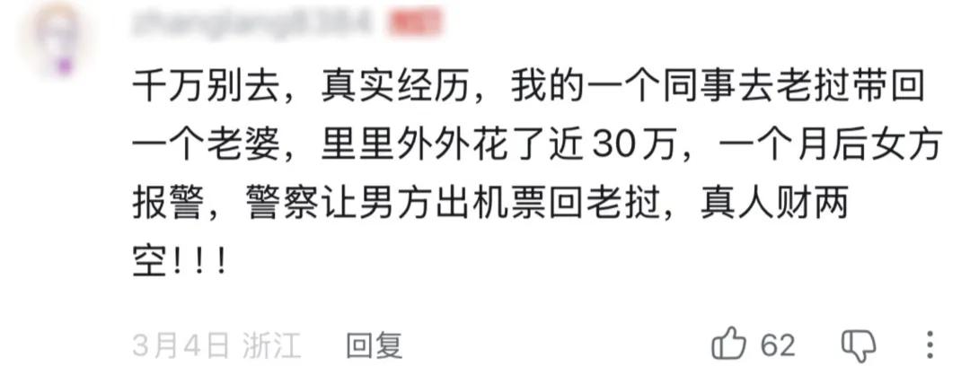 事实上,每当有人在社交平台炫耀自己找到老挝媳妇时,评论区总会有那么三两个人泼冷水,称“小心诈骗”“我朋友的老挝媳妇已经跑了”……无奈声量太小,常被“求介绍渠道”“流下羡慕的泪水”之类的留言所淹没。