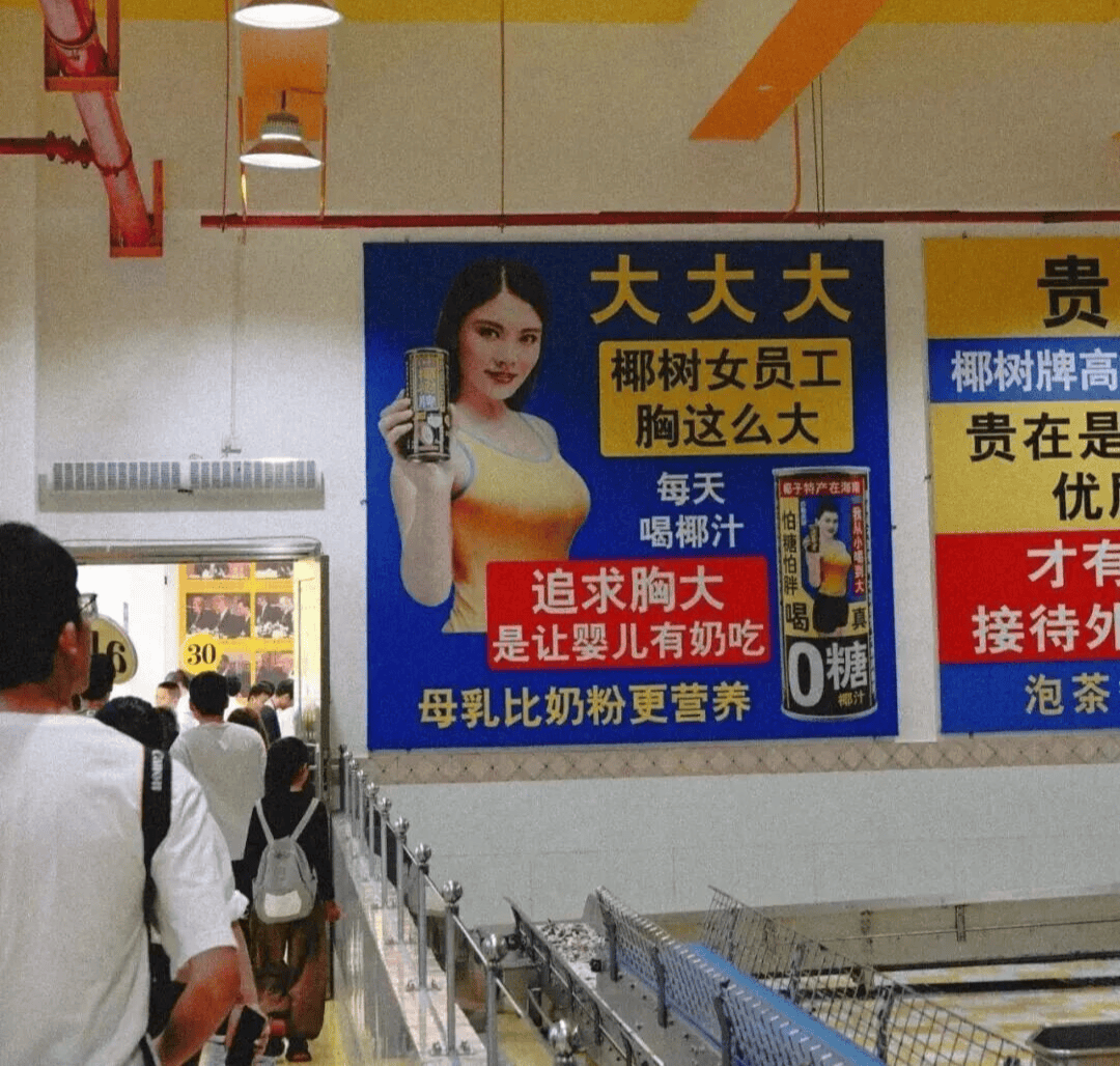 到了2022年,椰树让女性穿着紧身衣和短裤跳舞直播带货,2024年宣传“用椰汁擦乳”“南太平洋美女很少‘飞机场’”,再度引发争议。