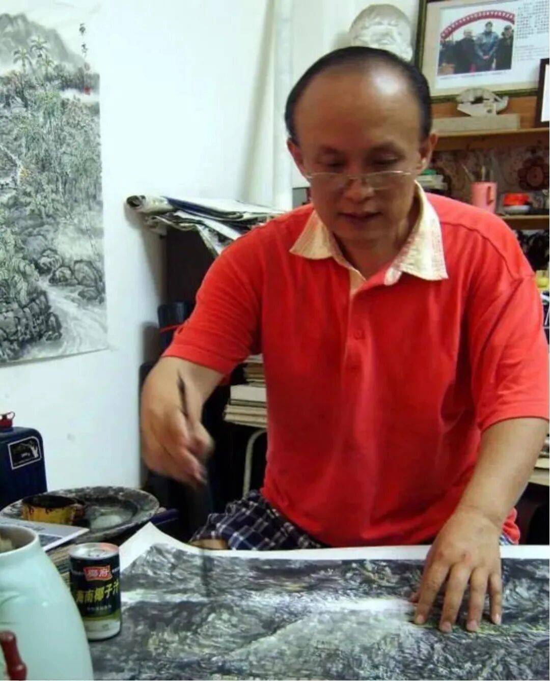 柯兰亭作画时桌上摆着一瓶椰树椰汁