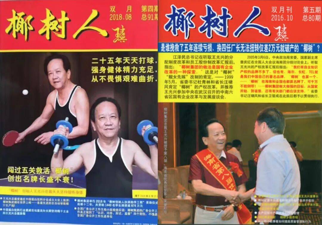 刊登的文章更是充满对王光兴的个人崇拜色彩,将椰树的发扬壮大都归功于王光兴一人:“不是一帮人,而是王光兴总裁单枪匹马独自一人救活了‘椰树’”“王总裁指点江山、英勇果断,不畏恐吓诬告,力挽狂澜救‘海罐’”。