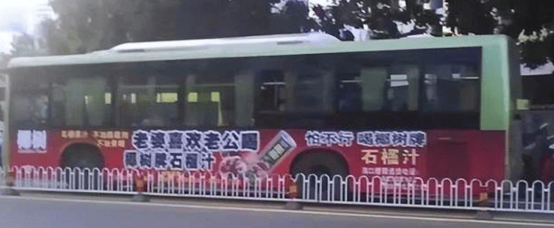 到了2009年,椰树更是大胆将新品果汁的广告语,比如“老婆喜欢老公喝椰树牌石榴汁”“怕不行,喝椰树牌石榴汁”“木瓜饱满我丰满”,印在了公交车车身。