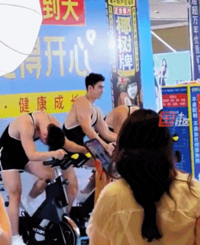 也许是钱给到位了,穿着紧身吊带背心的男模们,不仅骑在动感单车上表演引人遐想的扭胯动作,还大方走进人群互动,和前排的女孩们拥来抱去,现场的尖叫声差点把商场掀翻。