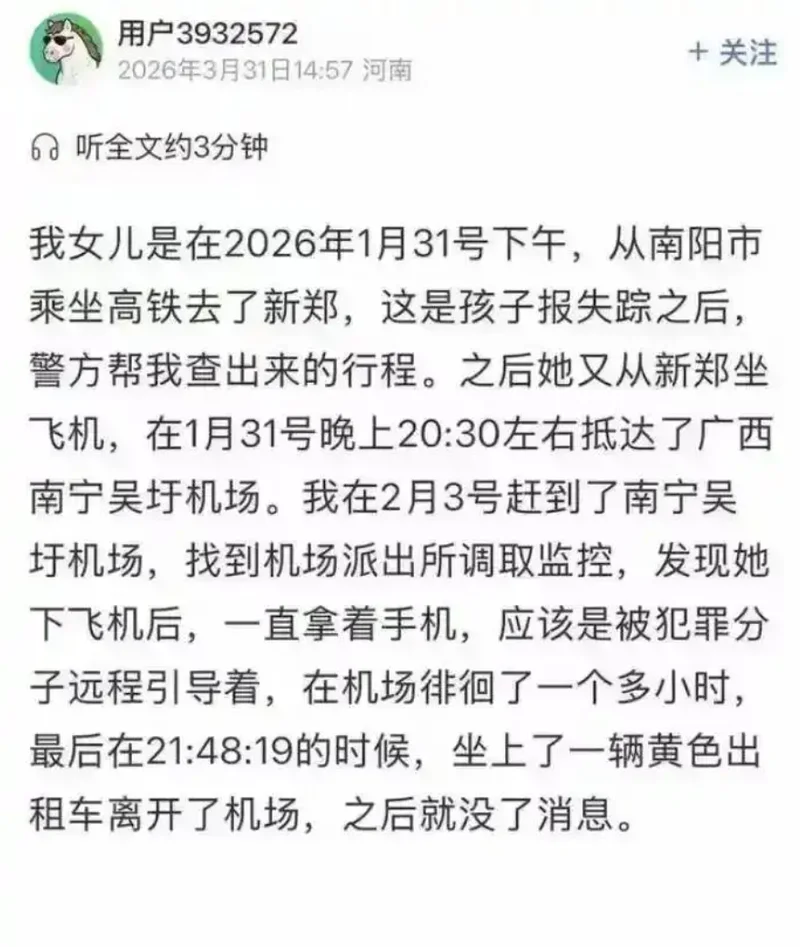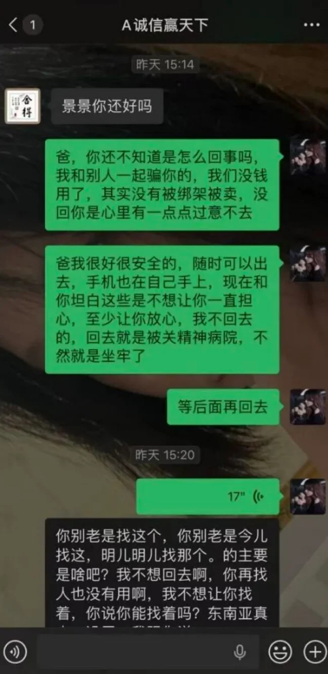2026 年开春,河南南阳19岁女孩景景的柬埔寨失联事件,像一块石头砸进舆论场,连着好多天揪着无数网友的心。父亲仝先生为了救女儿,变卖了家里能换钱的资产,前前后后打过去11万多赎金,换来的却是女儿被殴打、遭性侵威胁的视频。可就在全网都为这个女孩揪心、自发呼吁跨国营救的时候,一则自称是景景本人发布的视频,让整个事件来了个惊天反转。因为女孩居然说,自己是自愿去的柬埔寨,所谓的殴打视频全是演给父亲看的戏。曝出了一个让所有人都震惊的指控,那就是她曾多次遭到父亲的猥亵。一夜之间,原本清晰的案情,彻底变得扑朔迷离...................................................................01..............................................................故事的起点,是2026年1月31日那个再普通不过的冬夜。景景给家里打了通电话,语气平淡得像往常报备行程,说自己要回老家一趟。家人没多想,只当是小姑娘想家了,谁也没料到,这通电话,是她以完全自由的身份,和家里做的最后一次正常沟通。关于她这趟行程的初衷,后来出现了两个完全相悖的说法:仝先生和早期媒体报道里,她是被境外电诈团伙远程洗了脑,才用回老家当幌子,一步步踏上了出境的路。而景景自己的说法是,她从一开始就是为了逃离这个家,远赴柬埔寨和网恋对象奔现。其实在给家里打那通电话之前,景景就已经走完了大半行程。 1月31日下午,她就彻底脱离了家人的视线范围。2月2日,本该到老家的景景彻底没了踪影,电话关机,微信发出去石沉大海,家里人问遍了老家的亲戚,没人见过她。不祥的预感瞬间裹住了这个家,仝先生第一时间报了警。警方顺着监控一查,才发现景景根本没往老家的方向走,一路向南去了广西。仝先生急疯了,当天就赶到南宁找机场派出所调了监控,画面里的细节,现在想起来都让人后背发凉。 当晚20点30分,景景落地南宁,她没去取行李,也没像普通旅客一样排队打车,就攥着手机,在接机大厅里来来回回走了快一个小时。21点48分左右,她特意绕开了人群,拐进了机场的监控盲区,再出现的时候,已经坐上了一辆黄色出租车,彻底消失在了夜色里。就在当天凌晨,她的手机定位最后一次出现在中越边境的广西东兴市,之后信号彻底断了,仝先生和家人再也联系不上她。失联的第四天,也就是2月7日,景景的手机突然亮了。可微信那头说话的,根本不是景景,是个陌生男人。 他开门见山:“景景在柬埔寨波贝,拿20万来换人。” 仝先生追问女儿的情况,对方只留下一句嚣张的挑衅:“我在柬埔寨,你来吧,你来找我。”从此方就正式开启了勒索,20万的开价,对仝先生这样的普通务工家庭来说根本就是天文数字。他红着眼跟对方说,自己砸锅卖铁也凑不出这么多钱,磨了好久对方才松口,让他先打6000USDT(泰达币,一种加密虚拟货币)。折合人民币差不多4万块,还拍着胸脯说“给钱就放人”。 2 月 10 号晚上,仝先生找遍了亲戚朋友,凑齐钱打了过去,可对方收了钱,立刻就变了卦,连人影都没放。转天景景趁着看守不注意,偷偷给仝先生发了条微信,说自己已经被卖到柬埔寨拜林的电诈园区“上班”了。2月14号的晚上,她拼了命想给自己搏一条生路。她靠着前几天装出来的听话顺从,换来了一个让园区司机押着出去买生活用品的机会,就在街上的那几分钟里,她抓着唯一的窗口,给父亲发了精准定位,还特意补了一句关键信息:“从园区单程开车到这里,大概需要25分钟。”她把所有生还的希望,都压在了这条信息上。可这次自救,没能换来奇迹,反而招来了更疯狂的报复。没拿到后续赎金,又发现了景景的自救行为,犯罪团伙彻底撕了伪装。他们直接拨通了仝先生的视频电话,当着这个父亲的面,对着景景拳打脚踢,还撂下了毫无人性的威胁:为了救女儿,仝先生含泪卖掉了家里唯一的汽车又凑了钱。前前后后他已经付了11万多,可对方依旧扣着人不放,还用景景的微信发来挑衅:“你来找我,找到算你牛。”其实早在2月6号仝先生的妻子就已经在当地报了警,直到3月31日下午,中国驻柬埔寨使馆也同步介入,协调跨国营救的事。仝先生对着镜头说,女儿在园区里被折磨得已经有了自杀倾向,手腕上全是刀割的印子,他和妻子已经走投无路,只能靠着公开求助,盼着能有更多人关注,帮他把女儿救回来。这件事经多家媒体报道后,全网都炸了,网友们自发发起了“赛博通缉令”,都在喊着要严惩凶手,帮着呼吁跨国营救。 可就在所有人都为景景的安危奔走,全网都在呼吁营救的时候。一则从柬埔寨发来的视频,让整个事件彻底转了向。视频里的女孩自称是景景,一连发了好几段内容,把之前“被诱骗绑架、遭勒索殴打”的说法全盘推翻。还曝出了关于原生家庭的惊天内幕,让原本就复杂的事件更添了一层迷雾。视频里的女孩说,自己去柬埔寨完全是自愿的,就是为了网恋奔现,从来没有被谁诱骗、胁迫过。至于之前全网疯传的殴打视频、轮奸威胁的录音,她也给了说法,说全是自己配合别人拍的,根本没真的挨打,拍这些就是为了骗父亲的钱,因为当时自己在柬埔寨身上没钱了。而相信大家和表姐一样都好奇她为啥这么干,她的话让所有人都沉默了。她说这不是一时冲动,就是为了逃离这个家,逃离自己的父亲。 当然,到现在为止,这些都还只是她单方面的说法,警方已经立案,最终的真相还是要等官方的通报!现在网上吵翻了天,两个完全对立的版