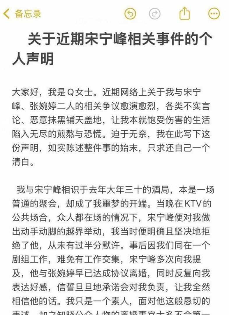 2026年4月3日深夜至4日凌晨,Q女士通过社交账号发布长文回应。她声称,两人相识于2025年大年三十的一场工作酒局,宋宁峰当时就对她有越界举动,但被她拒绝。后来因工作交集,宋宁峰主动追求她,并多次表示自己已与妻子张婉婷协议离婚,只是未公开,她才选择相信并交往。