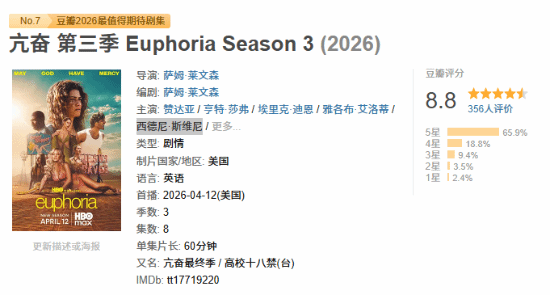 由赞达亚、西德尼·斯维尼主演的《亢奋》第三季豆瓣开分8.8分!65.9%的观众给出5星好评。 给出好评的观众表示又好看有攒劲儿,“《亢奋》正式从青春期的迷醉梦幻走向了成人阶段的现实主义”,网友更是锐评道:悉尼妹只能说本色出演了。