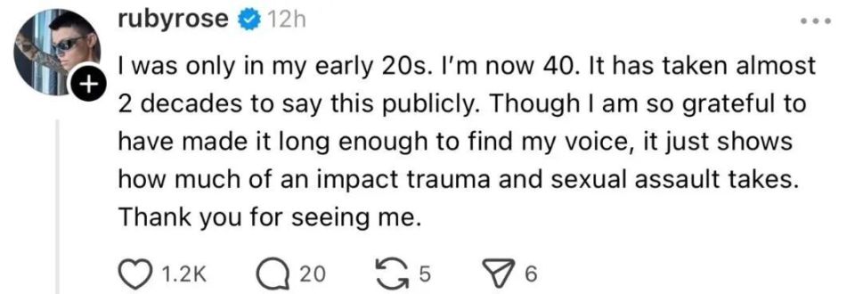 鲁比·罗丝表示,事件发生在近20年前,当时她年仅20出头,如今已40岁。她透露,事发后曾将此事包装成“醉酒趣事”公开,因凯蒂·佩里同意帮她(澳大利亚人)办理美国签证,她便一直对此保密。起初她并未打算报案,但称持有相关照片,且事件有多名目击者,随后在与网友交流后确认已提交警方报告。