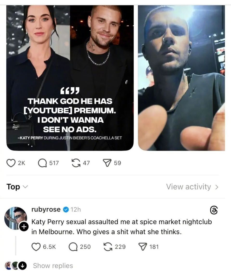 4月12日,鲁比·罗丝在回复一条关于凯蒂·佩里对贾斯汀·比伯科切拉音乐节表演反应的帖子时,公开了这一指控,称事件发生在墨尔本香料市场夜总会。她详细描述,当时自己为躲避凯蒂·佩里而靠在好友腿上,对方却俯身拉开内裤,将私处蹭到自己脸上,导致她当场呕吐。