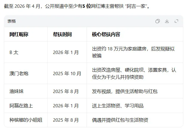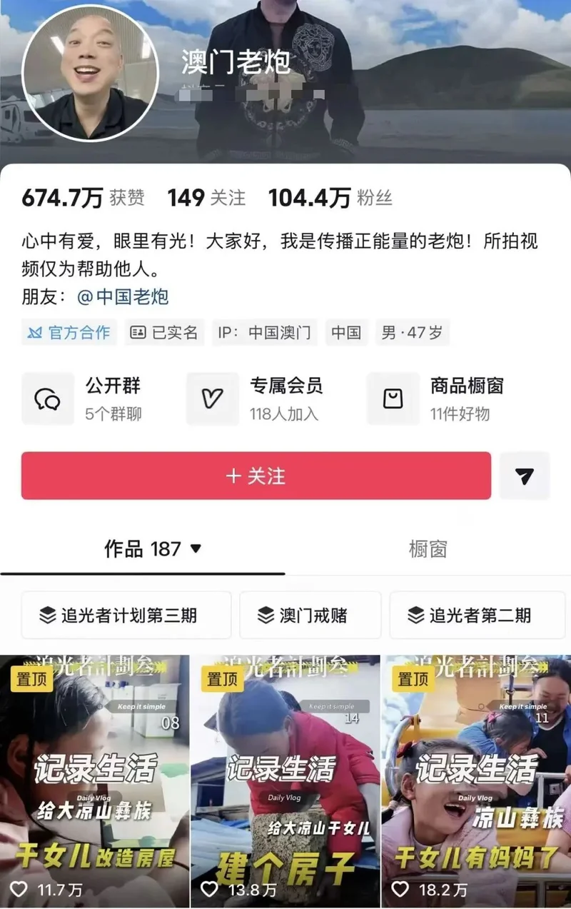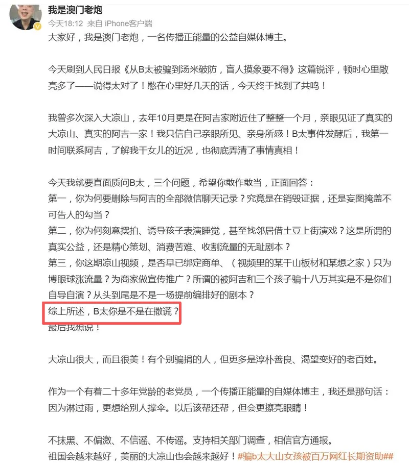 最近这两天,全网都在心疼B太。作为千万粉丝的打假博主,天天教别人如何避坑,结果自己被骗了18万。4月18日,同为受害者的百万网红“澳门老炮”,突然调转枪口怒怼B太,质疑他被4个女孩骗18万根本不是真的,全是自导自演的剧本,用词极其锋利。图源:微博小雷哔哔(id:xiaolei bbb)看的是一脸懵,都是被阿吉一家骗的受害者,怎么转头就内讧起来了?之前B太自曝,3月份他刷抖音,发现了18岁女孩阿吉,听她哭诉「父亲重病、4姐妹相依为命、家徒四壁」,心一软决定帮忙改造房屋,最后花了差不多20万。不过,钱不是说给就给的,总得去看看实地情况吧?就在B太说要去看看的时候,阿吉那边支支吾吾,说要准备一下。B太当即觉得不对劲,他索性提前一天,直接摸到了阿吉家。好家伙,这一看,全露馅了。人家父亲不仅身体硬朗,还爱赌钱,把低保和孩子学费都输光了;所谓的“家徒四壁”,其实特意用来摆拍的破房子,家里其实有好几处住处,家里也有两个哥哥和一个弟弟,好几个劳动力。说的有多惨,其实全都是瞎编的。 评论区眼尖的网友扒出,女孩用着苹果手机,做着美甲,房梁上挂满了腊肉香肠,很多人的生活条件都没她们好。 图源:小雷制图 图源:小雷制图说起来,这个突然开撕的澳门老炮,是一位104.4万粉丝的博主,平时拍戒赌和公益内容。他去年10月就帮过阿吉一家,置顶的3个视频全是帮扶内容,认了阿吉的侄女当干女儿,帮她们建房子、买家具、添书桌,甚至还帮侄女联系泰国妈妈收养,只不过被阿吉拒绝了。 图源:微博一开始B太曝光被骗时,澳门老炮还点赞力挺,说自己也帮过阿吉,对B太揭露骗局这一行为表示理解和支持,并分享了自己同样被骗的经历。4月14日,澳门老炮宣布永久终止对凉山女孩阿吉一家的所有资助,并公开声明不再提供任何帮扶。结果没几天,他就突然变脸,4月18日,澳门老炮联系上阿吉后,拿着俩人的聊天记录,直接对B太发出灵魂三问,态度180度大转弯。 图源:小雷截图第一问,为啥删除和阿吉的聊天记录,是不是在销毁证据?第二问,为啥诱导孩子摆拍睡觉、找邻居借土豆演戏?第三问,视频里提莫干山板材和梦想之家,是不是接了商单,拿被骗当剧本收割流量?其中小雷哔哔(id:xiaolei bbb)觉得最不可思议的是,他这一切质疑,居然都来自阿吉说的话。不是,哥,你忘了她已经骗过五个博主了吗?去年骗了你一遍,今年转头就能用同一套话术再坑B太,她的话现在还能信?拿着骗子的聊天记录当证据就算了。这三问真的有点离谱,尤其是用词,差点没把B太往死里整,要是真销毁证据、演剧本,B太这千万粉丝的号估计就要没了。 图源:微博小雷认为,澳门老炮的愤怒可以理解,但方向完全错了。澳门老炮的心态,或许是一种沉没成本导致的恼羞成怒。澳门老炮想着,自己帮了几个月,房子修了,冰箱买了,干女儿认了,结果在B太多视频上全看不见,阿吉还瞒着他的帮扶经历去骗下一家。小雷认为,他该质问的是阿吉,是当地村干部,而不是B太,因为B太也是受害者,凭啥要给你交代?可能是因为B太流量大? 图源:微博现在官方也介入了,凉山布拖县民政局说阿吉家是低保户,但镇政府又说她家过着小康生活,两边说法相互矛盾。阿吉已经被立案侦查,账号也被封了。小雷哔哔(id:xiaolei bbb)觉得,B太和澳门老炮,本质上都是心善的人,都是被阿吉的苦情戏骗了,真心想帮人,最后却闹得互相指责。阿吉一家也很难评,家里人都是游手好闲,哥哥结婚彩礼40万,现在欠外债20万,全靠阿吉出嫁来还。 整件事里说了谎的阿吉,现在反而成了旁观者,看着两个受害者内讧。一个18岁的女孩,能把5个大博主耍得团团转,不得不说,这演技比某些流量明星还强。