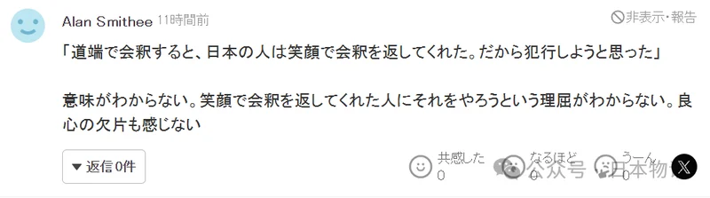 “在路边向别人点头打招呼时,日本人都会带着笑容回应我,所以我就动了犯罪的念头。”这让人完全无法理解。对那些善意微笑回应自己的人,竟然还能产生伤害他们的想法,这种逻辑根本说不通,让人感觉不到一丝良知的存在。