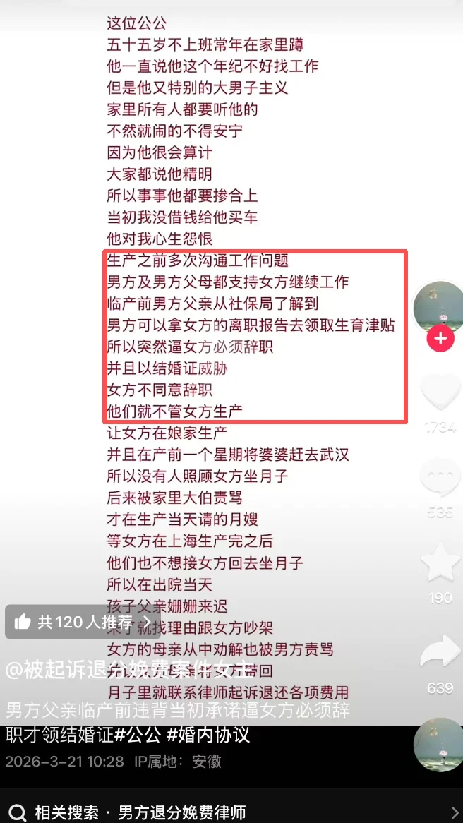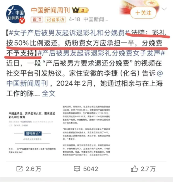 仅退款的风还是吹到了产房。最近,热搜上一桩“AA制生娃”的新闻在网上引发热议,讨论度空前,数次冲上热搜。不少网友看完惊呼:比杀猪盘还阴险的招出现了,简直是吃人还不吐骨头,这给全国女性都狠狠上了一课!事情的女主,是安徽的小李。24年2月,小李相亲认识男生小陈。小陈条件不错,在上海有体面工作,人老实话不多,两人很快确定了关系。次年2月,小李怀孕了。按照当地习俗,两人五一就在安徽老家办了婚礼,但没领结婚证。8个月后,小李生下孩子。可生完孩子还没出院,男方家里就因为孩子落户问题跑到医院去闹,两家人闹得很难堪。无奈下,身心俱疲的小李只好返回安徽老家坐月子。她本想等到过段时间,大家都冷静后再去好好商谈。万万没想到,半个月后,还在坐月子的小李收到一纸诉状。男方竟然以夫妻感情不和为由,把她告上法庭,起诉离婚。男方要求女方归还彩礼、三金等10万多元,还要女方退还分娩费、奶粉钱、月嫂费等等生育产生的费用。最让人瞠目结舌的是,连小李吃水果的钱,打车找男方见面的费用,男方都算在了里面,数字精确到小数点。 这已经不是抠门这么简单了,这跟白嫖有什么区别?彩礼悉数收回,生娃还要AA,相当于一分钱没花,娶了媳妇,生了孩子,甚至还要女方倒贴给他们。这简直就是一场“入室抢劫”般的婚姻,女方实惨。孩子抚养权男方要,彩礼和金器男方要,各种费用男方要求退还,她就是“重在参与”,帮男方生了一个孩子,可因为男方经济实力更强,到头来连孩子抚养权都抢不到。而且法院最后判定的结果是,彩礼退还50%,奶粉费女方承担一半,但男方要求退还的分娩费不予支持。 即便法院判决的结果是这样,也有很多网友为女方鸣不平,觉得她太不值得了。区区彩礼才几万块钱,而她的嫁妆要不回来,还要每个月承担孩子的抚养费,相当于这一切都给别人做了嫁衣。辛辛苦苦结了一个婚,辛辛苦苦生了一个孩子,孩子、嫁妆、金钱和精力投进去要不回来,而男方甚至连分娩费都不想出,女方无论如何都想不通。然而,后续随着舆论的发酵,有网友分析女方可能从一开始就被“做局”了!首先,小李刚怀孕,男方家就幺蛾子不断。那时他们婚后刚过6天,门上的红喜字都没热乎呢,公公就来找小李要20万买车。缘由是他想去跑货拉拉,美其名曰多挣点钱,小两口负担也轻。 但仔细一想,谁会买几十万的车去拉货?再说了,明知道家里没钱,还要买这么贵的车,不就是在打小李钱的主意吗?好在小李也不是恋爱脑,被她拒绝后,男方又改口说给几万块也行。最后小李出于感情,借给公婆一万元。存款没要出来,男方又打起女方工作的主意。因两人一直没有领证,男方借此要挟起了小李。想领证,就辞职,否则一拍两散。小李毫不留情地拒绝了,她月薪一万五,算是高薪。孕期辞职,收入减少不说,生完了能保证找到同等收入的工作吗?况且各种在职期间能享受的国家补贴也就都没了,得不偿失。男方却一直在规劝,一会说两人异地婚姻辛苦,一会又说女子要三从四德,听丈夫安排。 小李想不明白,既然想让她一起到上海生活,为什么不在怀孕前就提出来,非要等她怀孕才说?而且之前说给三四年缓冲期去离职,为什么现在又急着逼她辞职?男方到底图什么?一个可怕的想法,在小李心中成形。不辞职就不领证,男方就是吃准了孩子都有了,小李不得不为了家庭妥协。而且等到小李辞职后,男方就可以按照配偶失业的标准,领取国家生育补贴,也有不少钱。 这些猜想看起来有些荒唐对不对?可等到男方起诉离婚时,一切都变得合理起来了。开始给女方彩礼、三金加起来十万看似很多,实则是为了让女方死心塌地给男方生孩子。等到生米做成熟饭,再想办法把钱从小李手中抠出来。没成想小李是聪明人,一直不给钱,那么就利用没领证的漏洞,逼她辞职,制造离婚冲突把钱要回来。此时,小李刚生完。身体没恢复好,还因为两家人的矛盾患上了重度抑郁,根本没有能力争夺抚养权。在这场“离婚”大战中,男方不费吹灰之力拿回了大部分的钱,得了大孙子,还解决了小李这个“麻烦”。或许他们早就做好了“去母留子”的准备。而女方小李呢?孩子被夺走,归还了彩礼,男方却不肯归还她的嫁妆,身体搞坏,精神抑郁的情况下还要每月给孩子抚养费。 两年婚姻,精神崩塌,除了肚子上的刀口是真的,什么都没留下。有太多的网友在这件事里面感到意难平。还有网友辣评:说好听点是婚姻破裂,说难听点连代孕都不如,毕竟代孕都不用自己掏钱。 而整件事最让我唏嘘的,是小李前后境遇的对比。她曾那么优秀,有体面且薪酬高达1.5万的工作,她有清醒的认知和聪明才智,她本该有很好的生活.可她仅仅因为一次盲目的婚姻,就落得人财两空,身心俱残的下场。小李的境遇不仅仅只是她,对很多女性而言,婚姻却是一场不断下坠的消耗战,直至她们面目全非。 婚姻对女性最残忍的一面是什么?就是让一个原本光芒万丈,潇洒自如的女人,在无尽的搓磨中从此黯淡无光。几年前,看过的一个情感节目让我印象很深。一对婚姻破碎的夫妻,丈夫不断数落妻子,说她不修边幅,脾气暴躁,公司有什么要带家属的活动他都不敢带妻子去,生怕别人笑话。妻子听完委屈落泪,她沉默了很久后解释:想当年,她也曾知性貌美,工资高,妥妥的高质量女性,不缺人追,她也是千挑万选才嫁给丈夫。可婚后,丈夫家务不做,孩子不管