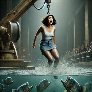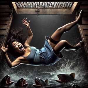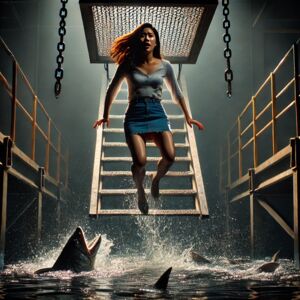 当 Tracy 被换上瑜伽裤,重新吊回水池上方时,水中的食人鱼变得更加躁动,仿佛嗅到了猎物的气息。她的双腿在瑜伽裤的包裹下显得更加修长,却也更加无助。