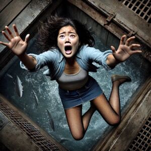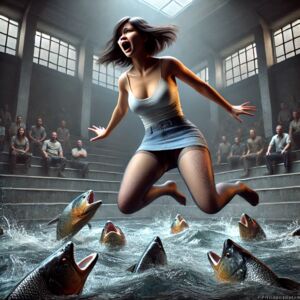 当士兵将她推入水池,冰凉的水瞬间包裹了她的身体。食人鱼感受到猎物的存在,迅速游向她,水面泛起层层波纹,平静的池水开始被搅动。