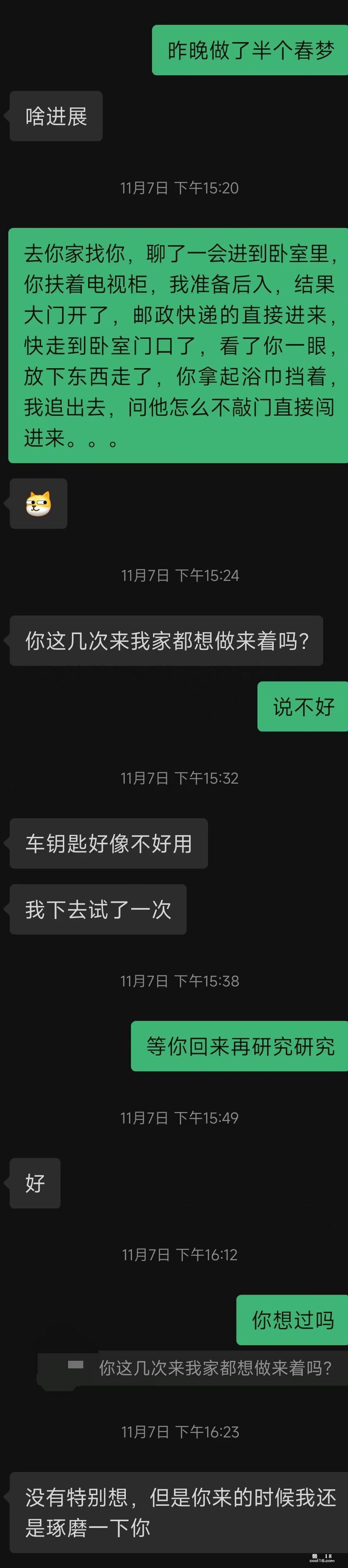 前几天做了半个春梦,为什么是半个呢,因为并没有完成。梦中去s家找她,两个人聊了一会,开始在沙发上吻起来,手也不老实的伸入内衣,握着她的乳房,很软,一边吻着,她伸手过来拉开拉链,套弄着我。梦里记不清了,一般这时候,她会从沙发上起来,跪在沙发前给我口,我一边享受着,一边抚摸着她的头发,有时候会压低她的头,来点深喉的感觉。梦中两人进到卧室里,让s弯腰扶着电视柜,s是高妹曾经是体育生,调整好位置我准备后入,结果大门开了,邮政快递直接走了进来,快走到卧室门口了,发现了我们盯着光着身子的两人,并没做什么只是看着,放下东西就走了,s拿起浴巾害羞的挡着身体,我追了出去。。。醒来后还告诉了s