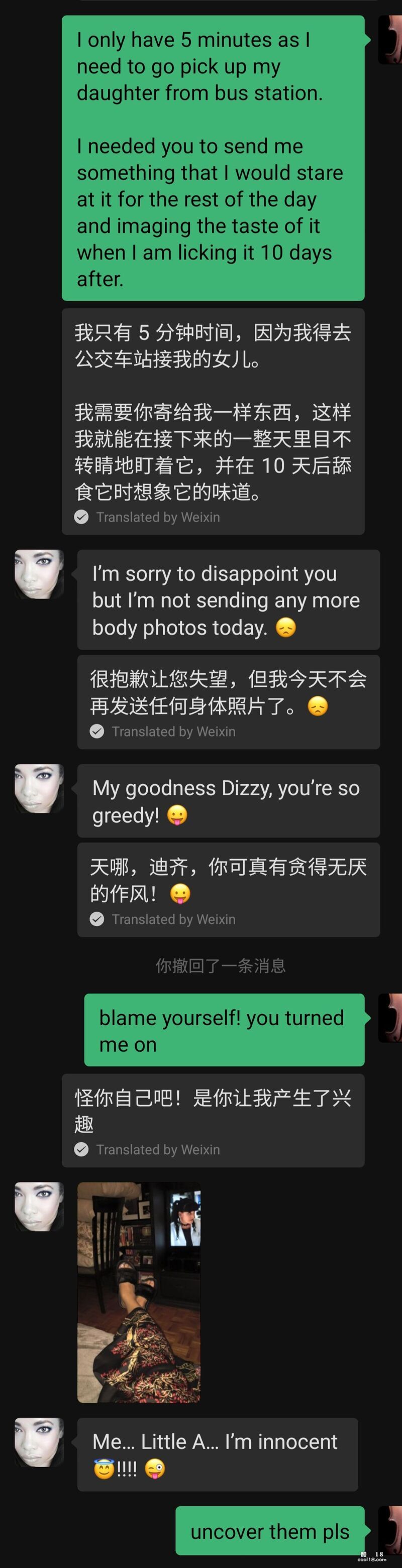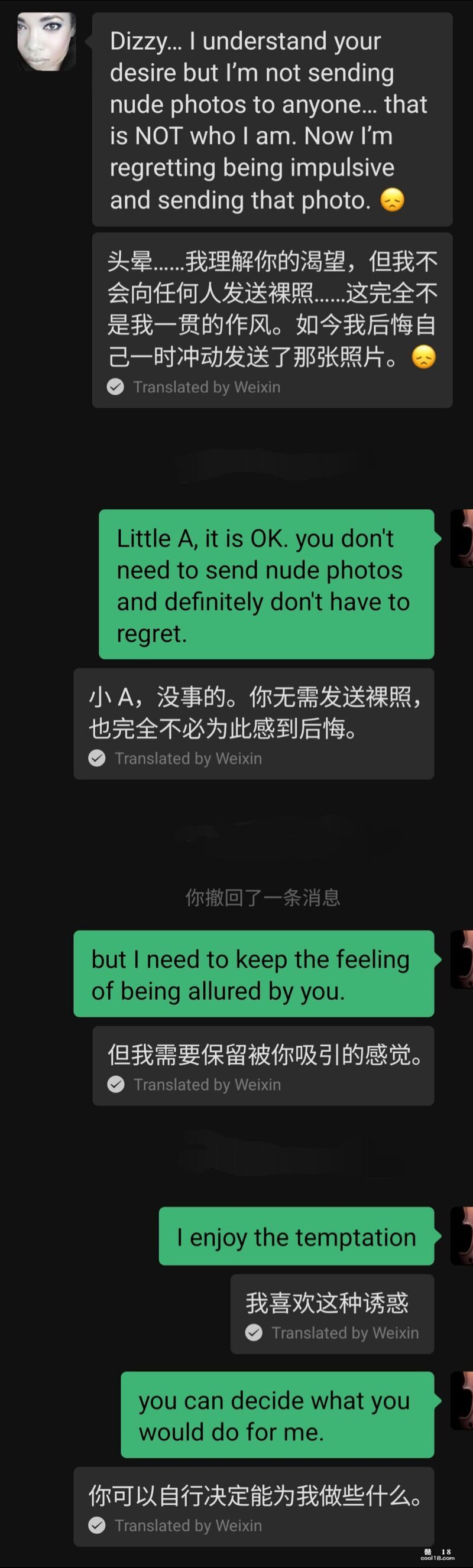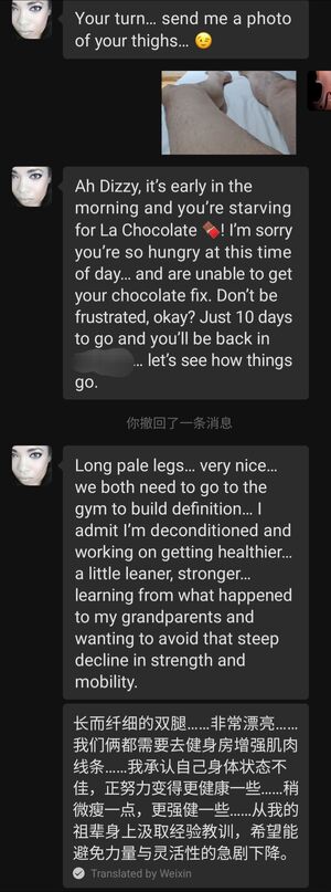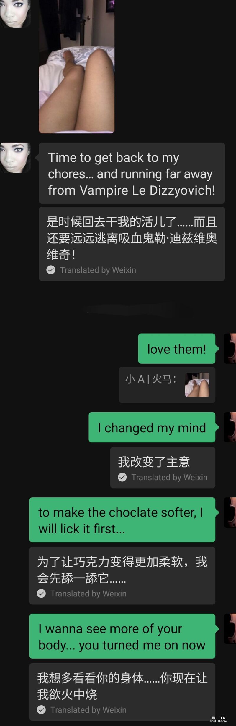 我很意外,因为之前她给我的印象是举止端庄、文雅大方的。突然给我发这样的慵懒休闲画面,明显是给我信号随后的一段时间 我们俩时不时就在微信上聊骚,她的名字首字母是 A 所以我叫她小 A,Little A。我跟她坦白说她的肉体对我有很大的诱惑,要求她发露肉照片给我,可是无论我怎样的启发、诱导、催促,她也只是给我发了几张她的大腿照,后来索性郑重拒绝了我任何发裸照的要求,出于对她的尊重,我也没再提出类似的要求。聊天截图如下,我加上了微信中文翻译帮助理解。我真的好良心。。。聊天的话题也渐渐变得比较正式、礼貌,不再涉及性方面。谈话中进一步得知她目前有一个固定的男友,是一名业界很有名的白人医生,两人关系很好已经同居十几年了,她对白人男友的女儿视同己出。两个月后 她来我的城市参加活动,日程排的繁忙紧张。傍晚时候在她住宿的酒店楼下咖啡馆坐了两个小时,聊天的话题涵盖了各类我们双方都喜欢的方面。后来因为晚上 我们两个人各自都有安排,只好告别。我给了她一个紧紧的拥抱,同时还亲吻了她的脸颊、耳根和头发,她也贴身抱了我,能感受到她的手以及身体的颤抖。后来的微信聊天中,她的态度起了变化,变得热情了很多,经常跟我表白。。。类似下面截图这样的。 亲们看到这里,是不是觉得我好事将近啦哈哈。。。其实故事有了反转。。。(未完待续)