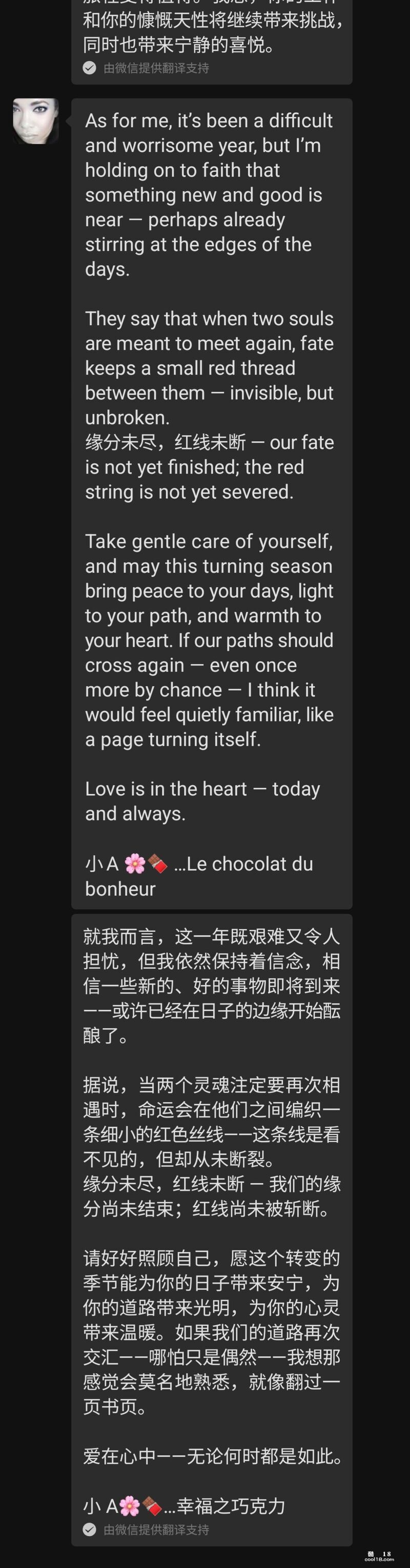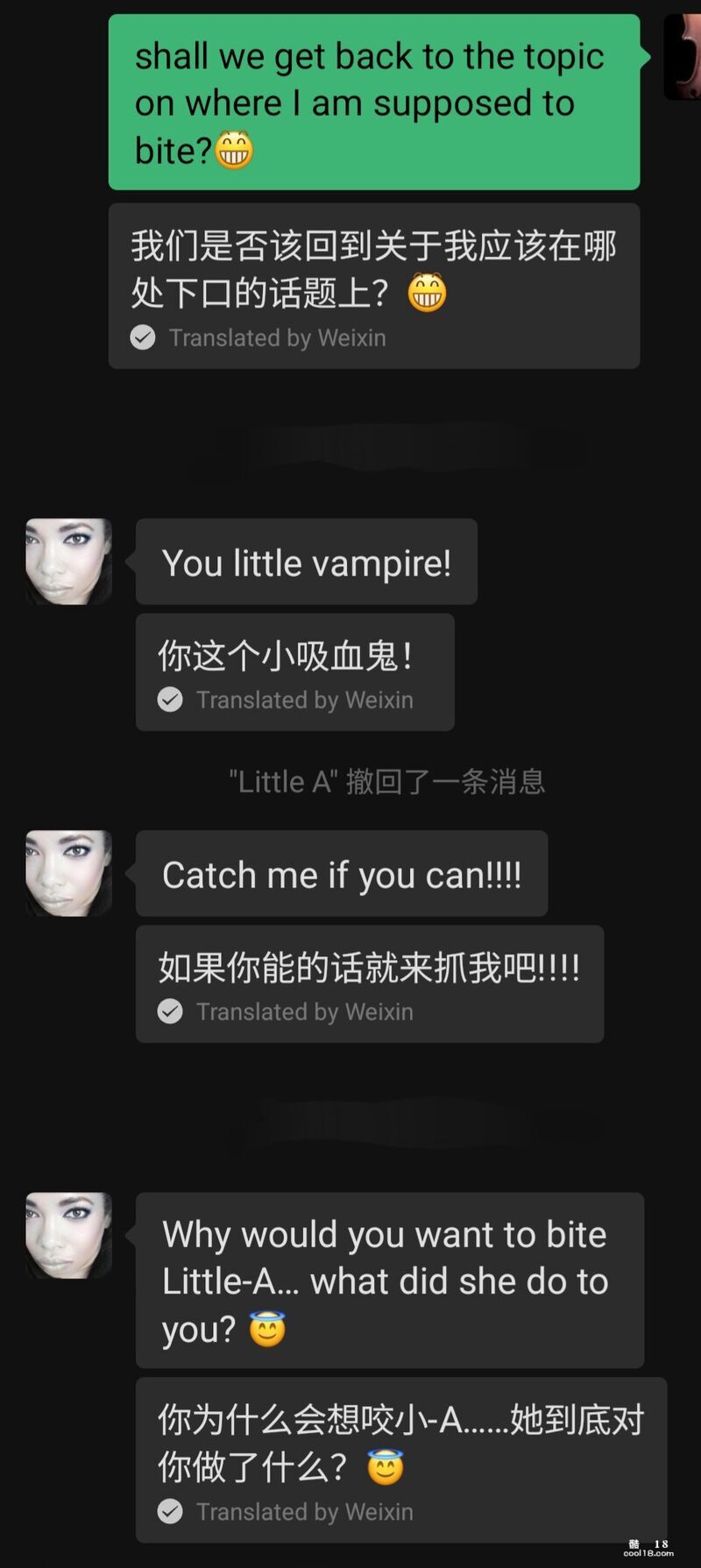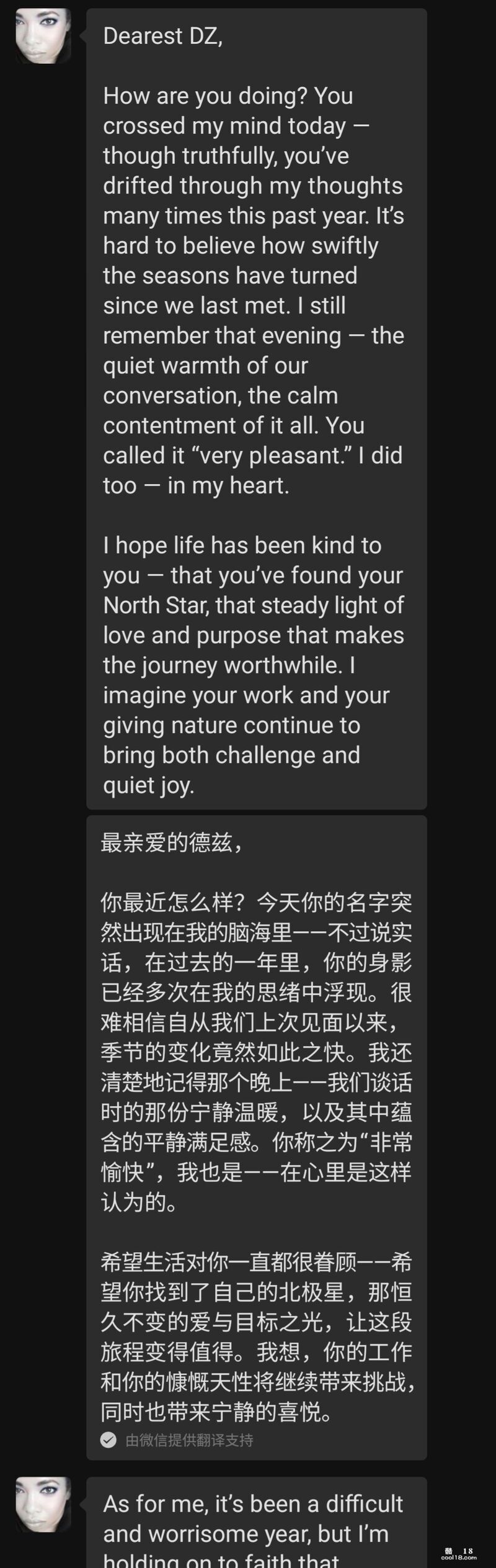 我很意外,因为之前她给我的印象是举止端庄、文雅大方的。突然给我发这样的慵懒休闲画面,明显是给我信号随后的一段时间 我们俩时不时就在微信上聊骚,她的名字首字母是 A 所以我叫她小 A,Little A。我跟她坦白说她的肉体对我有很大的诱惑,要求她发露肉照片给我,可是无论我怎样的启发、诱导、催促,她也只是给我发了几张她的大腿照,后来索性郑重拒绝了我任何发裸照的要求,出于对她的尊重,我也没再提出类似的要求。聊天截图如下,我加上了微信中文翻译帮助理解。我真的好良心。。。聊天的话题也渐渐变得比较正式、礼貌,不再涉及性方面。谈话中进一步得知她目前有一个固定的男友,是一名业界很有名的白人医生,两人关系很好已经同居十几年了,她对白人男友的女儿视同己出。两个月后 她来我的城市参加活动,日程排的繁忙紧张。傍晚时候在她住宿的酒店楼下咖啡馆坐了两个小时,聊天的话题涵盖了各类我们双方都喜欢的方面。后来因为晚上 我们两个人各自都有安排,只好告别。我给了她一个紧紧的拥抱,同时还亲吻了她的脸颊、耳根和头发,她也贴身抱了我,能感受到她的手以及身体的颤抖。后来的微信聊天中,她的态度起了变化,变得热情了很多,经常跟我表白。。。类似下面截图这样的。 亲们看到这里,是不是觉得我好事将近啦哈哈。。。其实故事有了反转。。。(未完待续)
