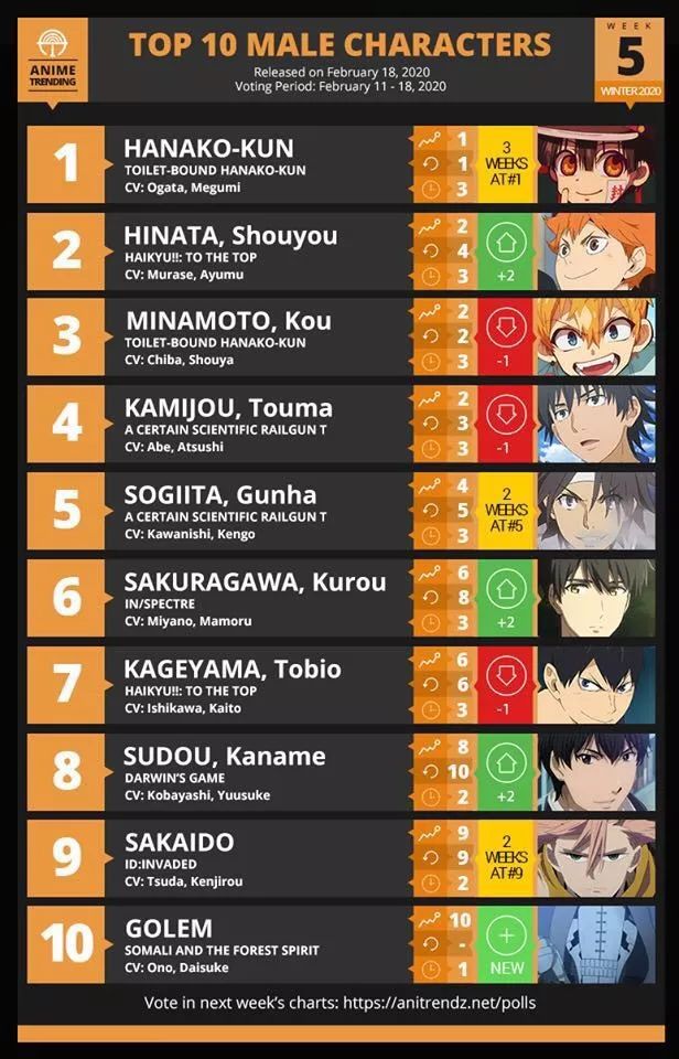 在各类新番男性角色排名中,他也同样接连霸榜。