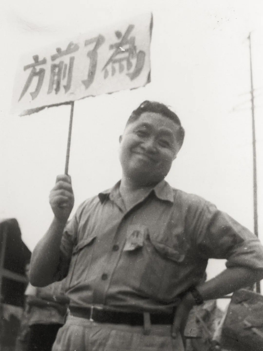A:我在整理张光宇的图片资料的时候,发现其中有一张是抗战时期,他胖胖的身形,插着腰,举一个牌子,那牌子上写着“为了前方”。他的“为了前方”非常清晰,我们要上前线去抗日。